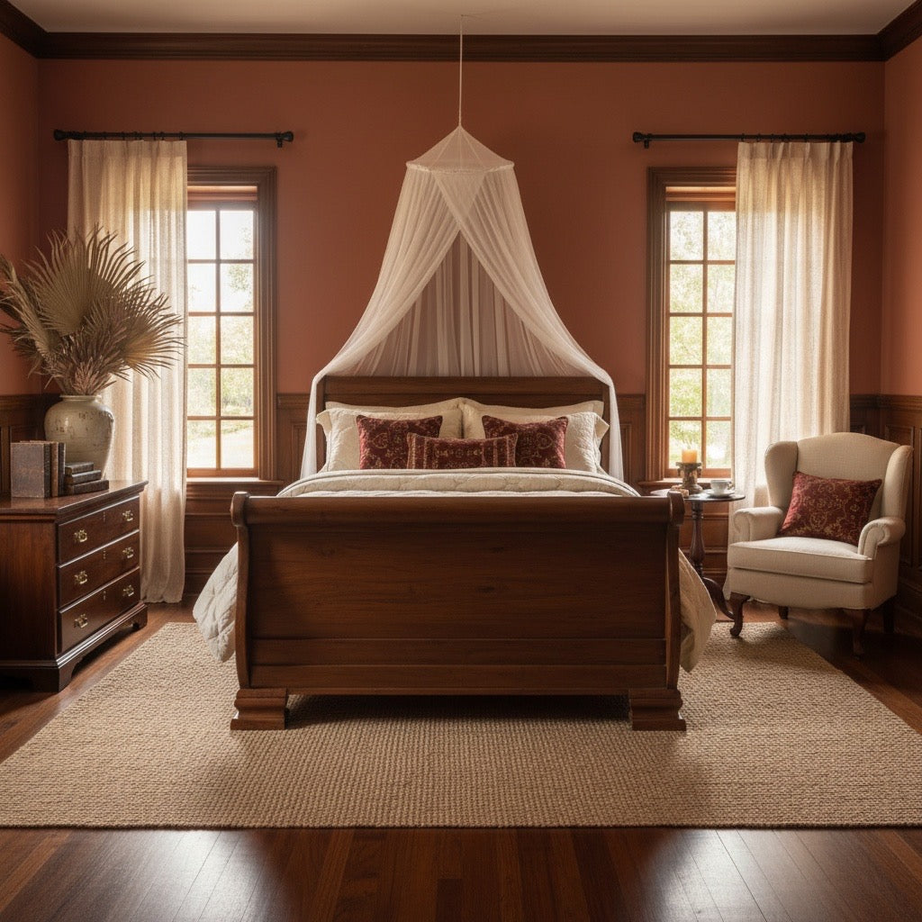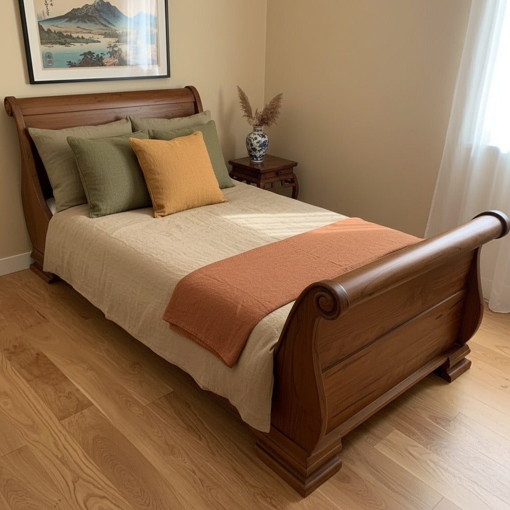 Cama colonial clásica en teca que representa la elegancia intemporal del diseño tradicional. Elige incluir o prescindir del piecero según tus preferencias estéticas y necesidades funcionales. La teca maciza proporciona una estructura robusta que perdura generaciones, desarrollando una pátina rica que realza su carácter. Completamente a medida, se adapta a tus dimensiones exactas sin comprometer su presencia majestuosa. Una pieza que evoca nostalgia refinada mientras ofrece la solidez y confort que mereces en tu descanso diario.