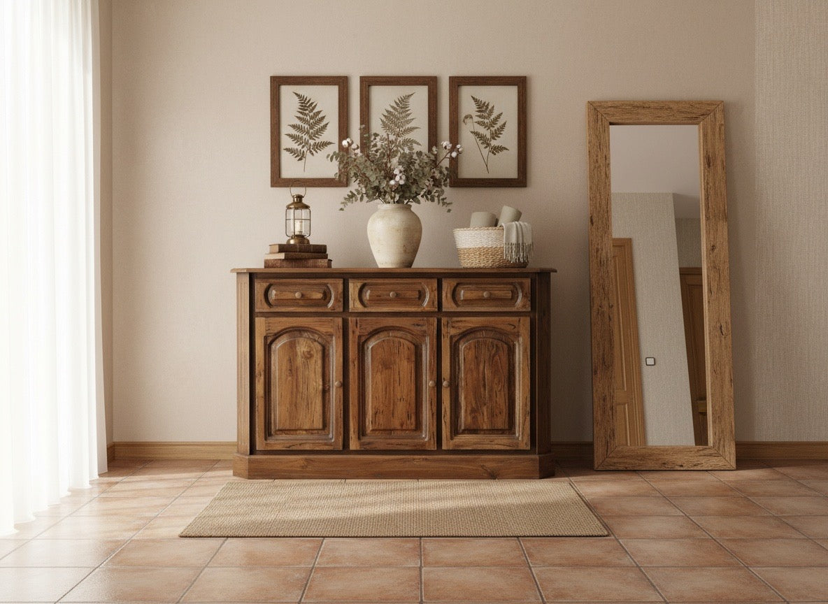 Aparador rústico a medida elaborado en teca, que transmite autenticidad y carácter genuino. Su construcción artesanal resalta la belleza natural de la madera, con acabados que enfatizan las vetas y tonalidades propias de la teca. Personalizable según tus dimensiones y preferencias, este mueble aporta personalidad a espacios que buscan una estética rústica con solidez estructural. Ideal para quienes valoran la calidad material y el diseño sin pretensiones.