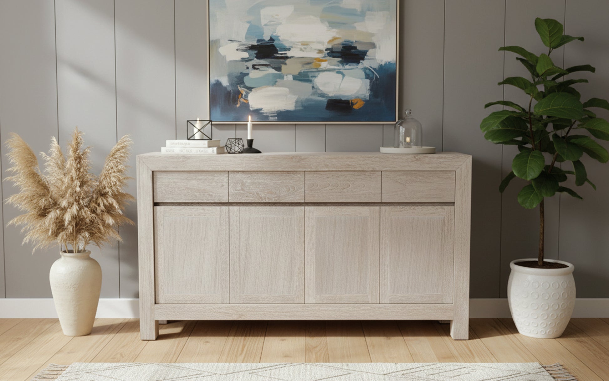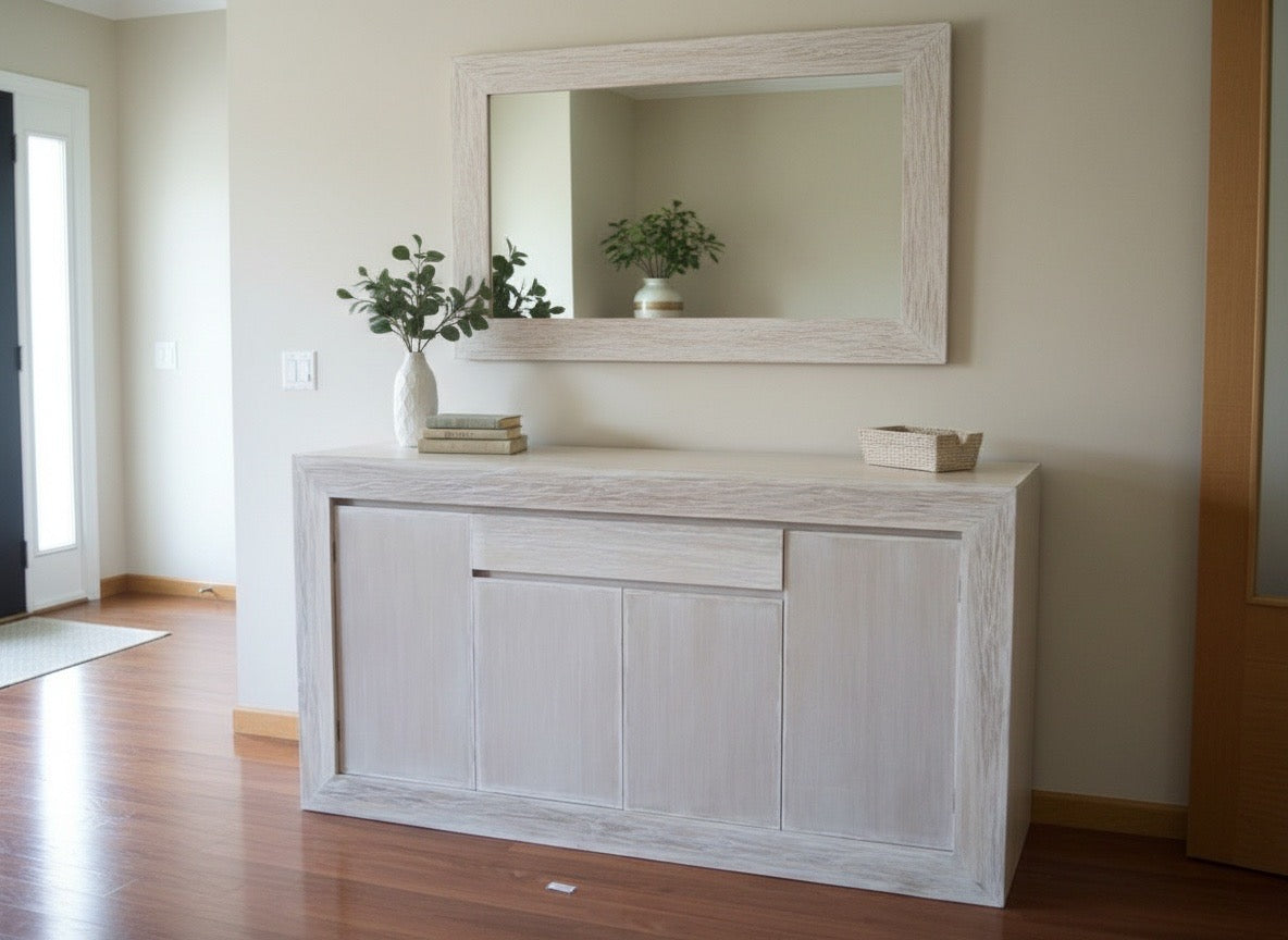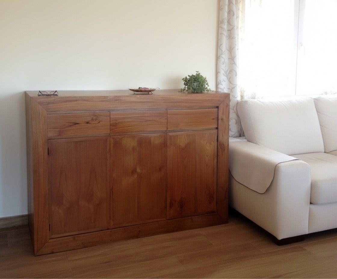 Aparador a medida en madera de teca estilo oriental AM202109281417. Aparador fabricado artesanalmente en madera de teca de estilo colonial-asiático. Diseño con líneas modernas y minimalista. Disponible en cualquier color y medida. Posibilidad de modificar la configuración de cajones y puertas.