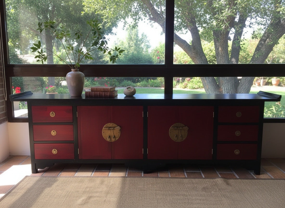 Aparador colonial asiático a medida con tapa volada, que combina elegancia y sencillez en un diseño atemporal. Acabado en rojo envejecido y negro que aporta calidez y personalidad al mueble, realzando su carácter colonial. La tapa volada constituye un elemento distintivo que añade sofisticación funcional. Fabricado artesanalmente, este aparador se adapta a tus especificaciones, convirtiéndose en una pieza singular que refleja tu gusto por el mobiliario auténtico y diferenciador.