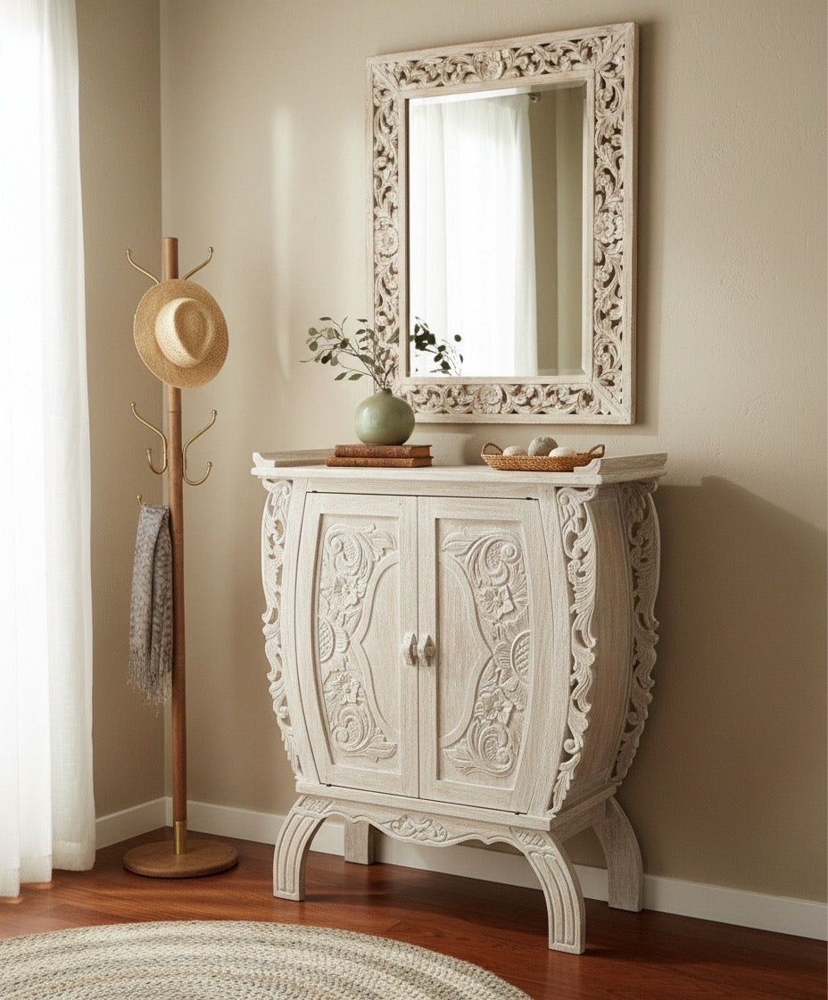 Aparador colonial asiático tallado en teca con acabado blanco decapado, personalizable a medida según tus requerimientos. Este mueble javanés destaca por su elaborado trabajo de talla artesanal, que confiere carácter y distinción a cualquier espacio. La combinación de teca natural con el blanco decapado crea un contraste visual sofisticado, realzando los detalles decorativos. Ideal para coleccionistas que valoran la autenticidad y la singularidad en su mobiliario.