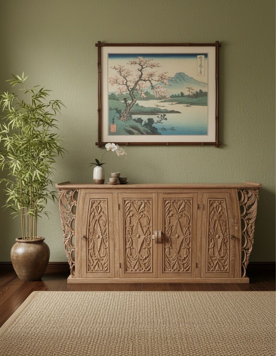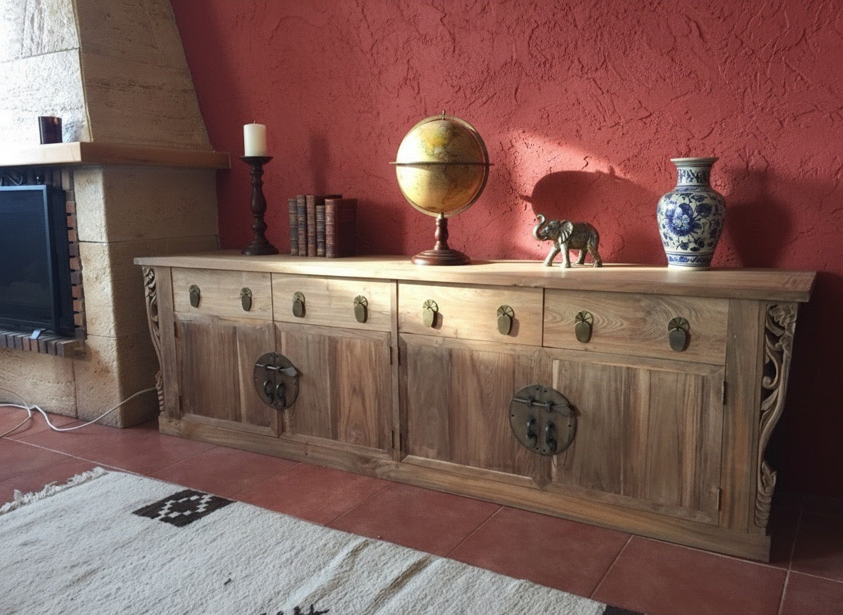 Aparador colonial asiático de teca , diseñado a medida según tus necesidades. Este mueble combina la elegancia del estilo colonial con detalles tallados propios de la artesanía asiática. Personaliza completamente la distribución de cajones y puertas para adaptarlo a tu espacio y funcionalidad. Disponible con o sin talla decorativa. Cierre chino tradicional que añade autenticidad y carácter. Madera de teca de primera calidad, resistente y duradera. Pieza única que transforma cualquier ambiente en un espacio sofisticado y diferenciador.