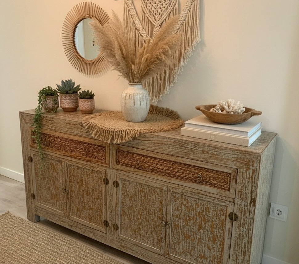 Aparador colonial asiático a medida en madera de teca y banana. Aparador de estilo colonial-asiático fabricado artesanalmente en madera de TECA y banana. Disponible en cualquier medida y color.