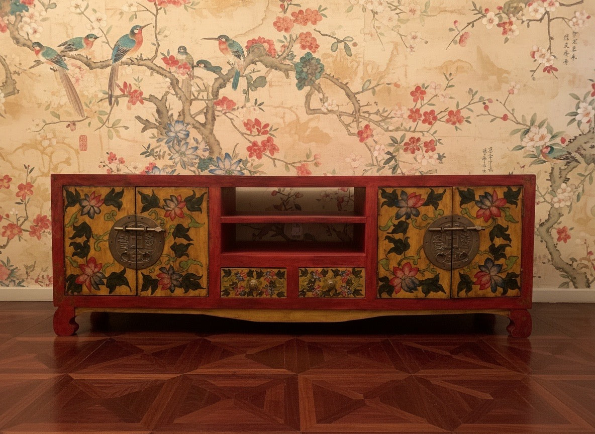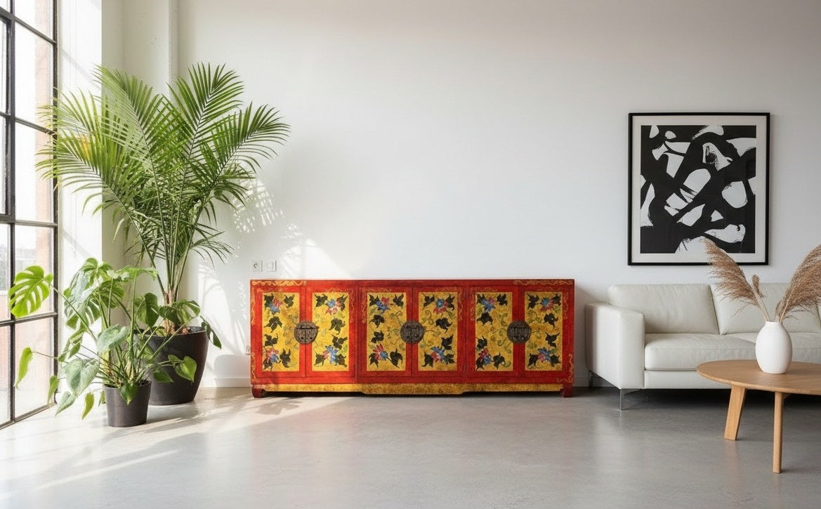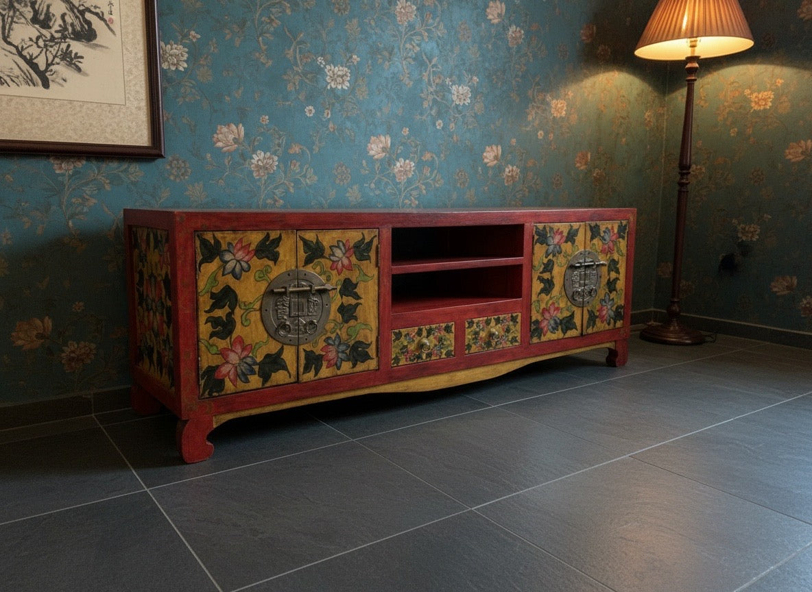 Aparador tibetano confeccionado en teca , con posibilidad de personalización total. Elige el motivo decorativo y la policromía que mejor se alinee con tu proyecto interior, creando una pieza verdaderamente única. La teca proporciona solidez estructural y una pátina natural que enriquece con el tiempo. Sus detalles inspirados en la tradición tibetana aportan profundidad cultural y autenticidad. Ideal para coleccionistas y diseñadores que buscan muebles de autor con carácter diferenciador y calidad artesanal superior.