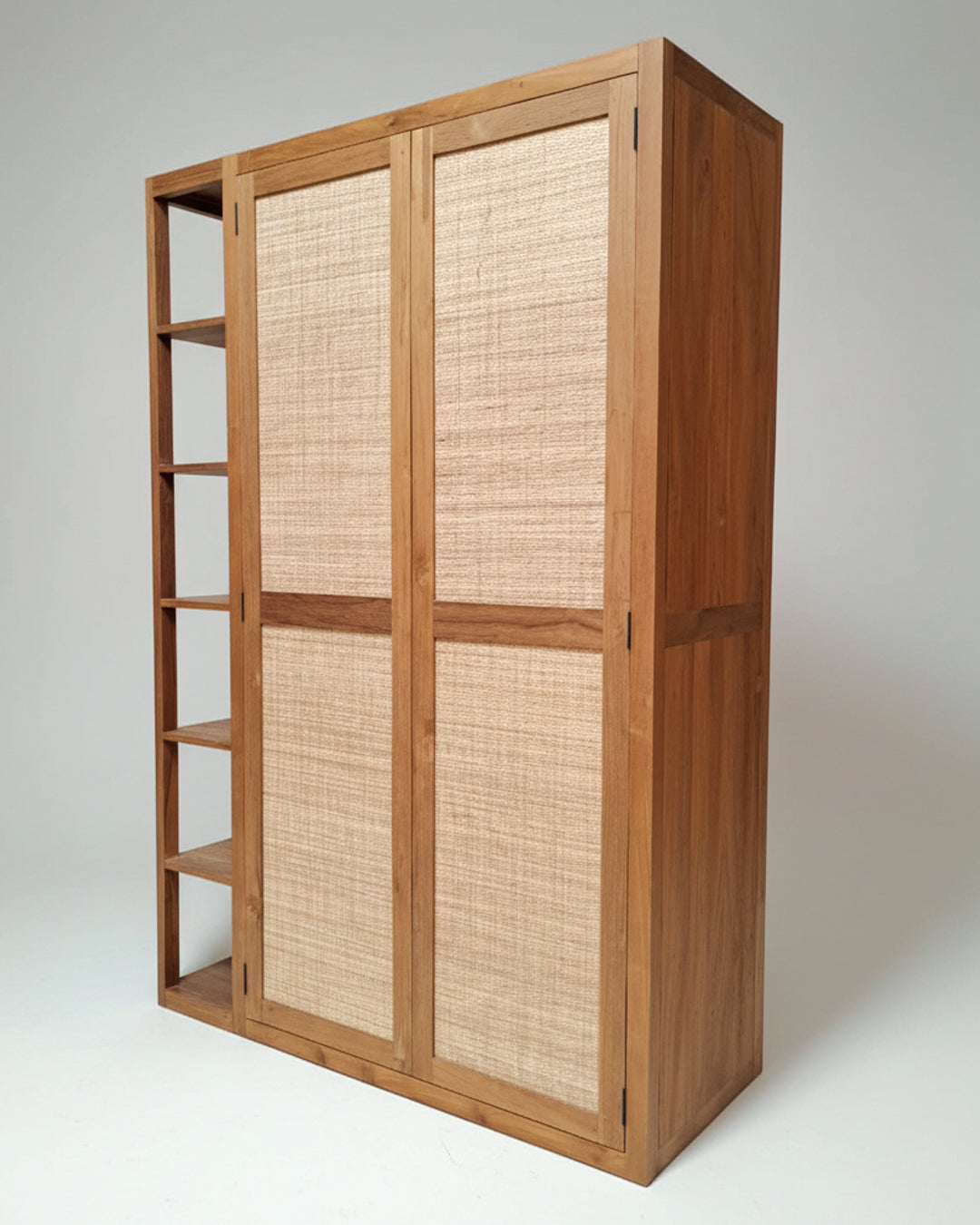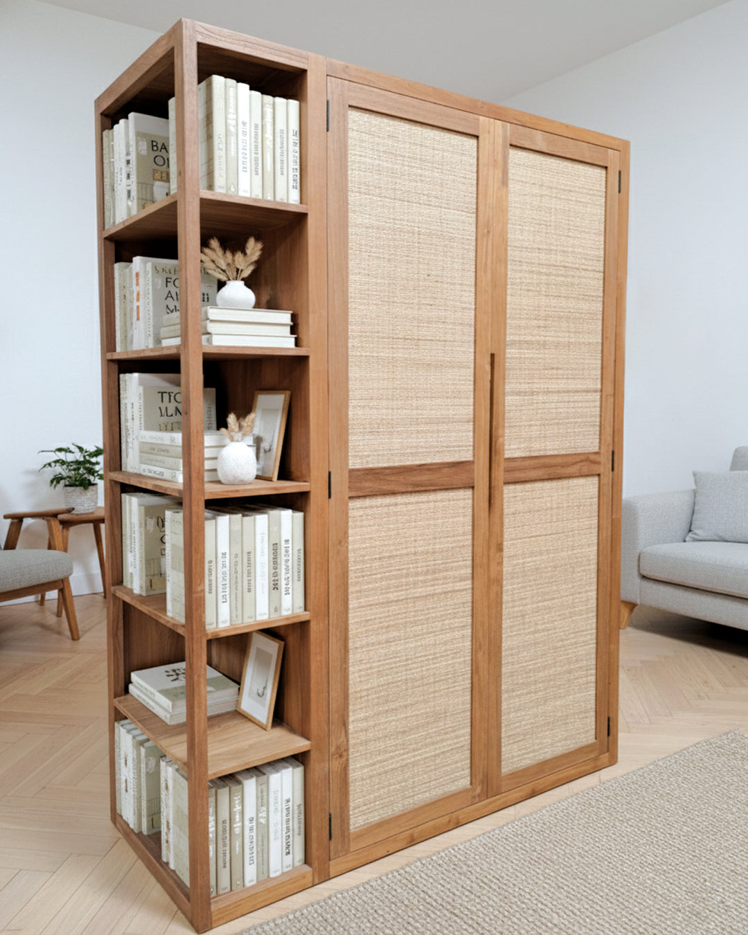 Armario a medida fabricado en teca maciza y fibras naturales de primera calidad, diseñado específicamente para adaptarse a tus necesidades de almacenamiento. La distribución interior se personaliza según tus requerimientos, permitiendo organizar espacios con estantes, colgadores y compartimentos a tu medida. La teca aporta durabilidad excepcional y una patina natural que mejora con el tiempo, mientras que las fibras naturales complementan su construcción sostenible. Ideal para dormitorios, salones o espacios comerciales que demanden funcionalidad y elegancia. Cada pieza es única, garantizando un mueble que se integra perfectamente en tu entorno.