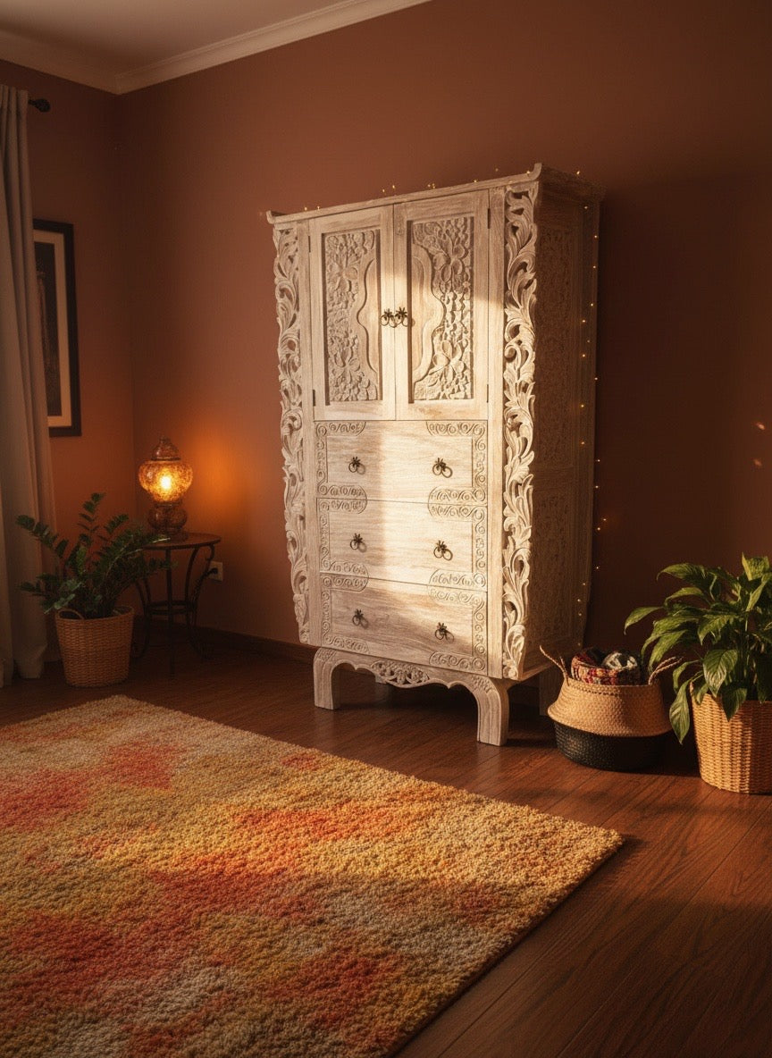Nuestro Armario Colonial-Asiático es una obra maestra de artesanía, tallado íntegramente en teca maciza con técnicas tradicionales que garantizan calidad excepcional. Cada pieza es única, reflejando la dedicación de maestros artesanos que dominan el arte del tallado. Disponible en cualquier medida y terminación, se adapta perfectamente a tus espacios y preferencias estéticas. Un mueble que combina funcionalidad práctica con belleza contemplativa, convirtiéndose en una inversión duradera que define tu hogar con elegancia atemporal y carácter inconfundible.
