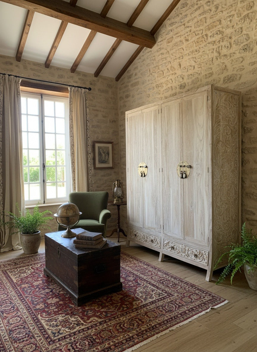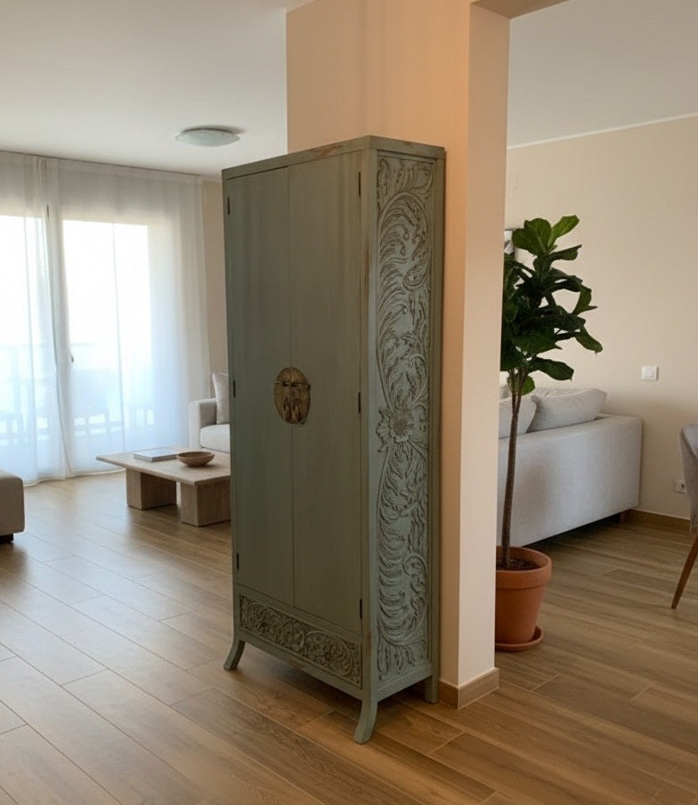 Nuestro Armario de Estilo Colonial-Oriental a Medida es una creación artesanal que celebra la maestría del tallado en teca maciza. Cada detalle refleja la dedicación de artesanos que dominan técnicas tradicionales, transformando madera noble en una pieza de carácter singular. Personaliza completamente tu mueble: selecciona medidas, colores y reorganiza puertas y cajones según tus preferencias específicas. Un almacenamiento que trasciende la funcionalidad, convirtiéndose en una inversión en belleza duradera que define tu espacio con elegancia atemporal y autenticidad oriental incomparable.