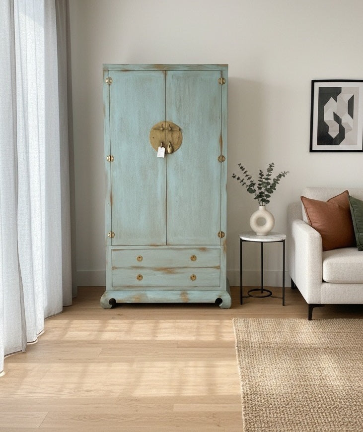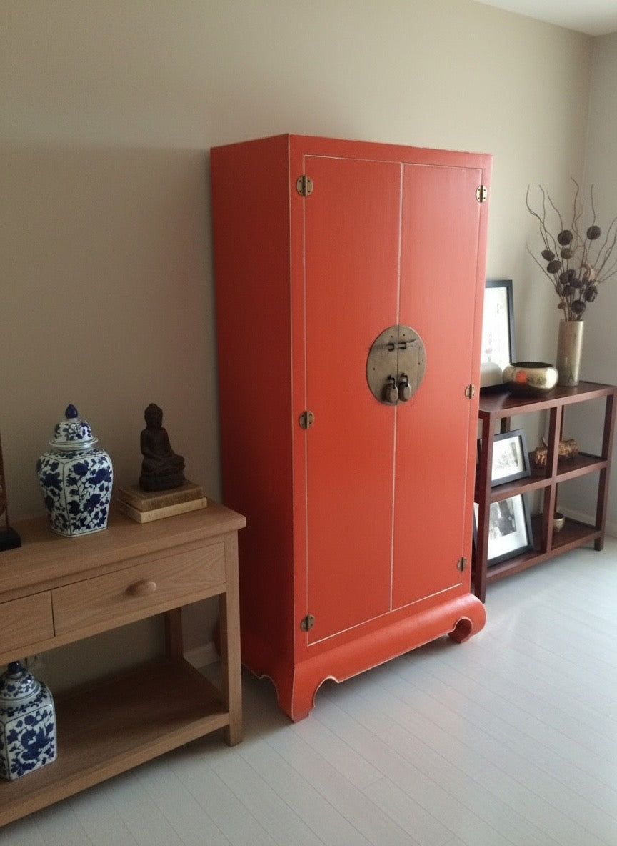 Armario estilo asiático-colonial en madera de teca a medida AM-14231. Armario de boda chino , estilo colonial-asiático fabricado artesanalmente en madera de teca. Disponible en cualquier color y medida.