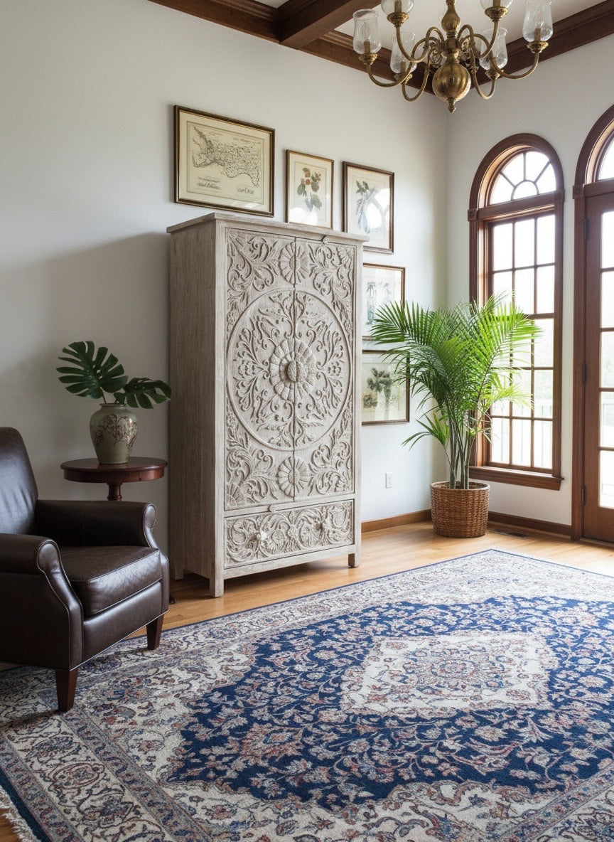 Descubre nuestro Armario de Boda Chino a Medida, donde una mandala original tallada se convierte en el corazón del diseño. Fabricado artesanalmente en teca, este mueble colonial-asiático combina funcionalidad práctica con belleza contemplativa, transformando el almacenamiento en una experiencia visual única. Cada mandala es una expresión de simetría y armonía, reflejando la profundidad del arte oriental. Personaliza medidas y acabados para que se adapte perfectamente a tu hogar u oficina. Una pieza que trasciende lo funcional, convirtiéndose en una obra decorativa que inspira serenidad y elegancia en tu espacio.
