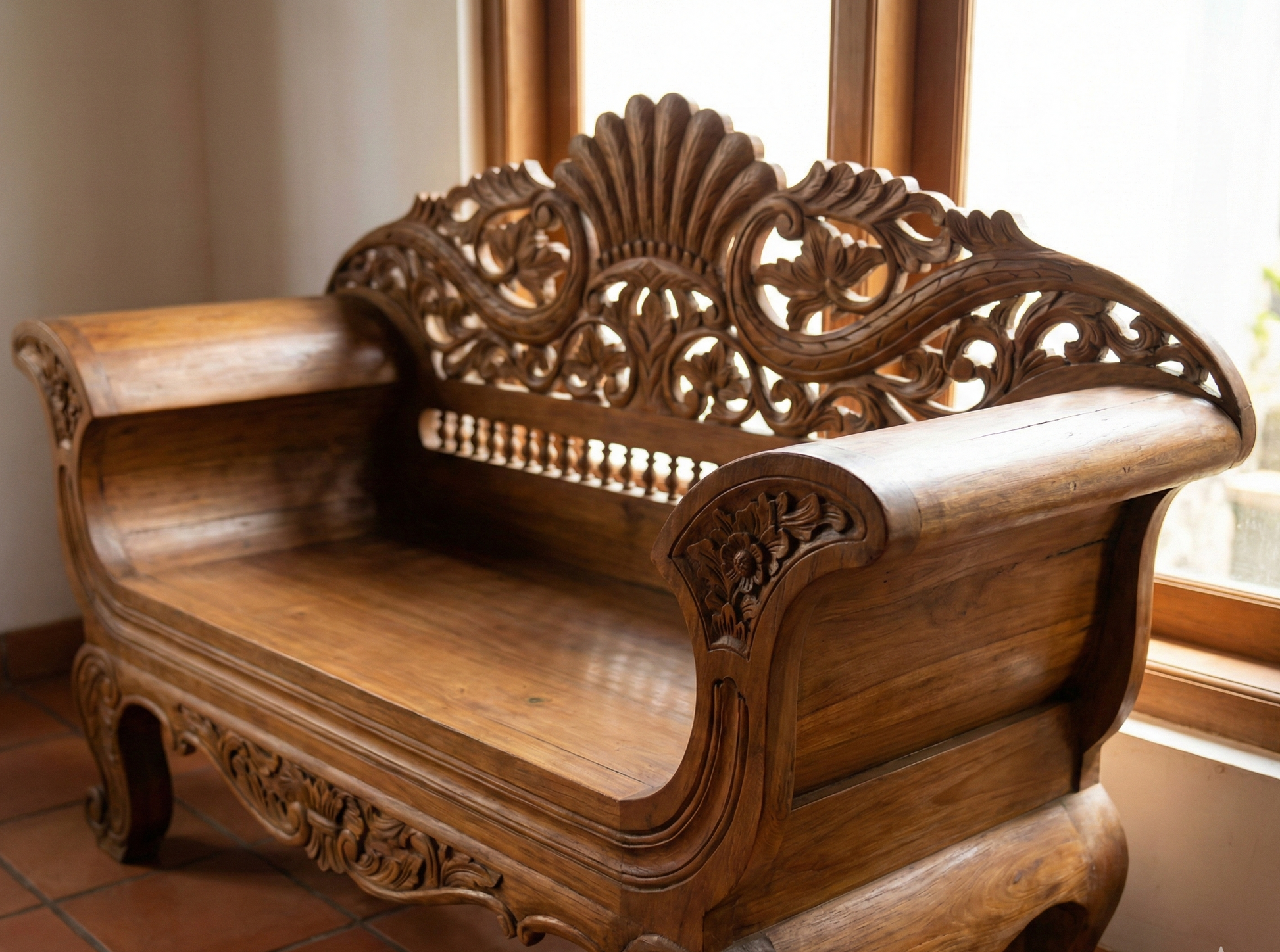 Banco colonial asiatico. Madera de Teca. Colonial asiatico de lineas curvas.