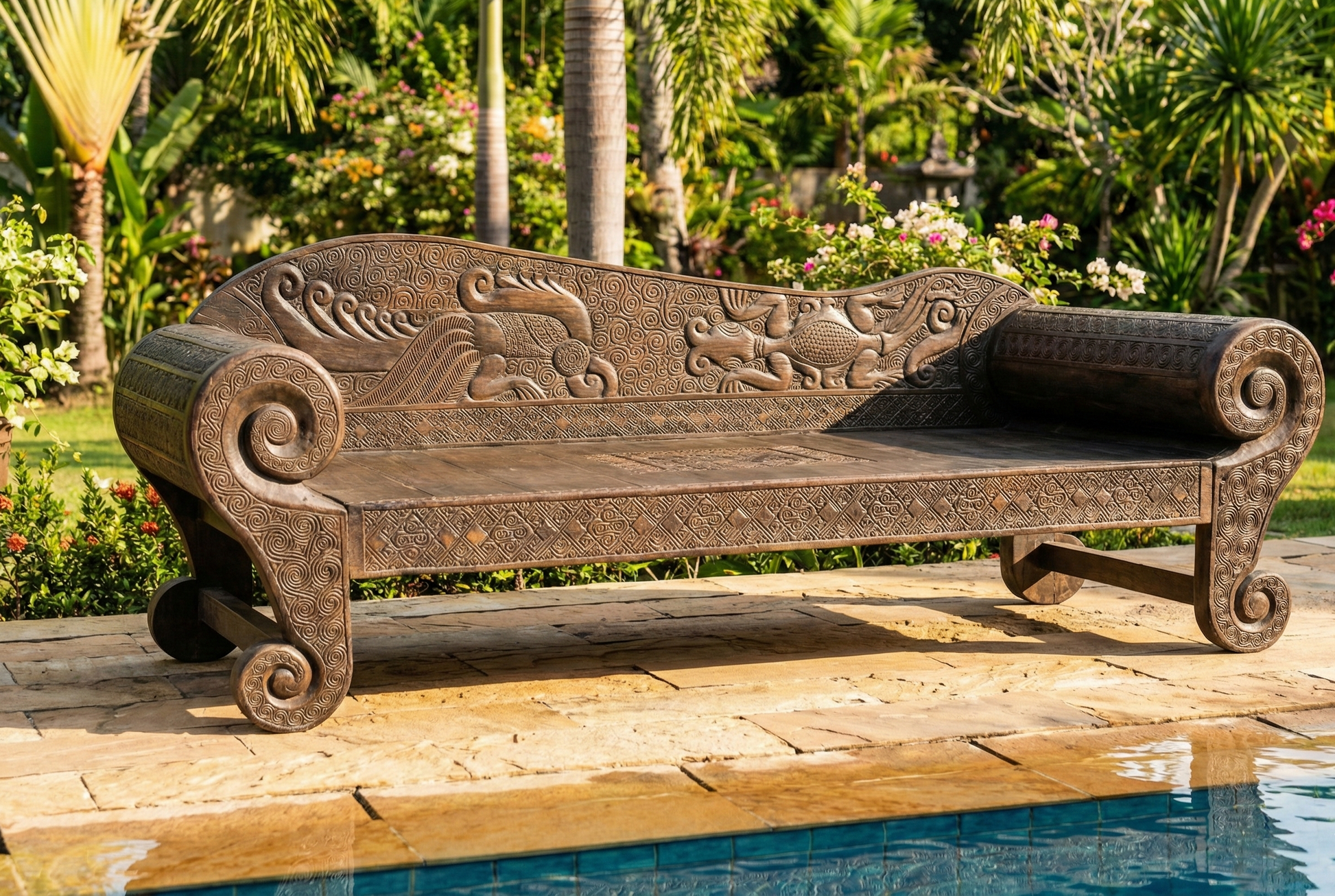 Banco a medida de estilo colonial-asiático fabricado artesanalmente en roja de Timor.