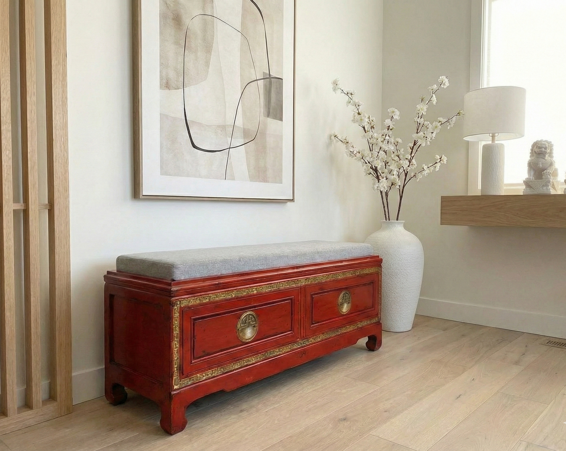 Banco en madera de teca con cajones frontales de estilo colonial-asiático fabricado artesanalmente en TECA a medida. Disponible en cualquier medida y color que necesites.