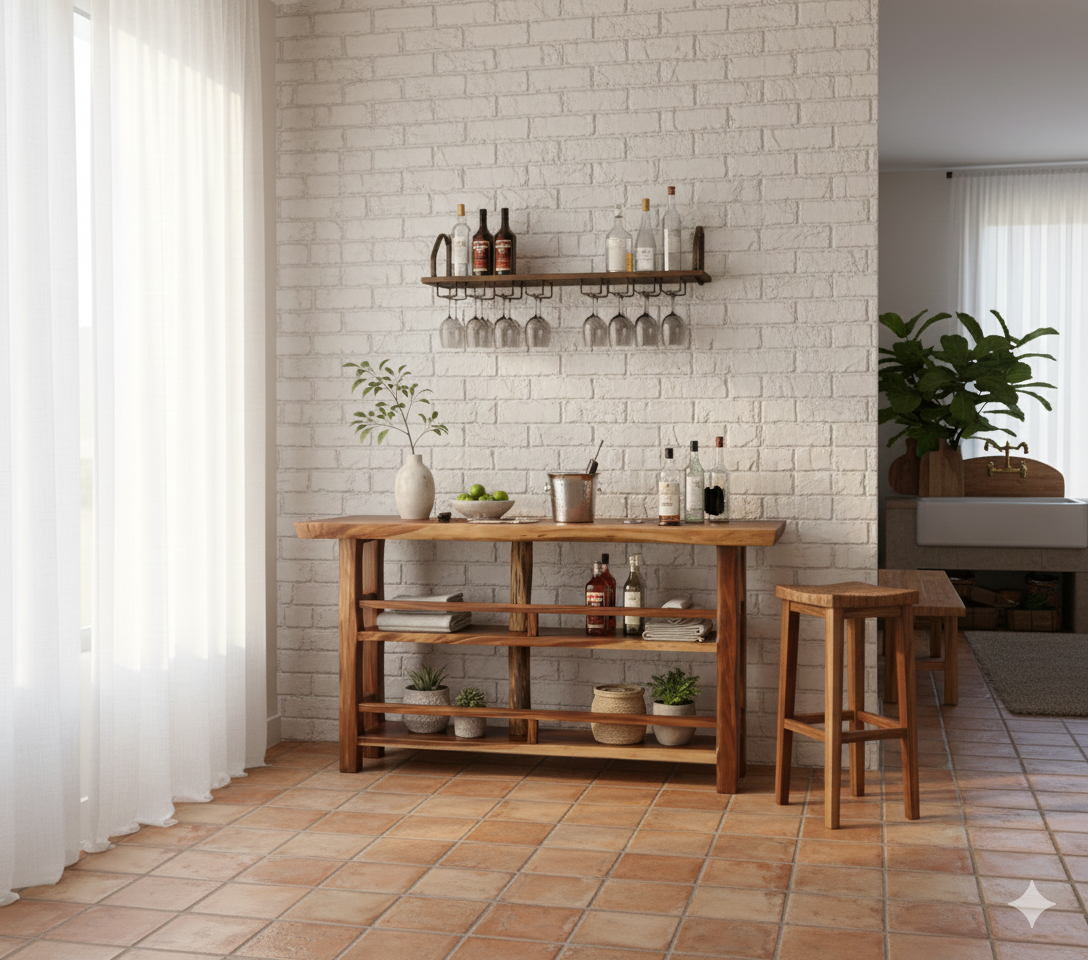 Barra de bar a medida de estilo asiático-colonial fabricada artesanalmente. Disponibilidad en cualquier medida y color según sus necesidades. Posibilidad de cambiar disposición de elementos según necesidad.