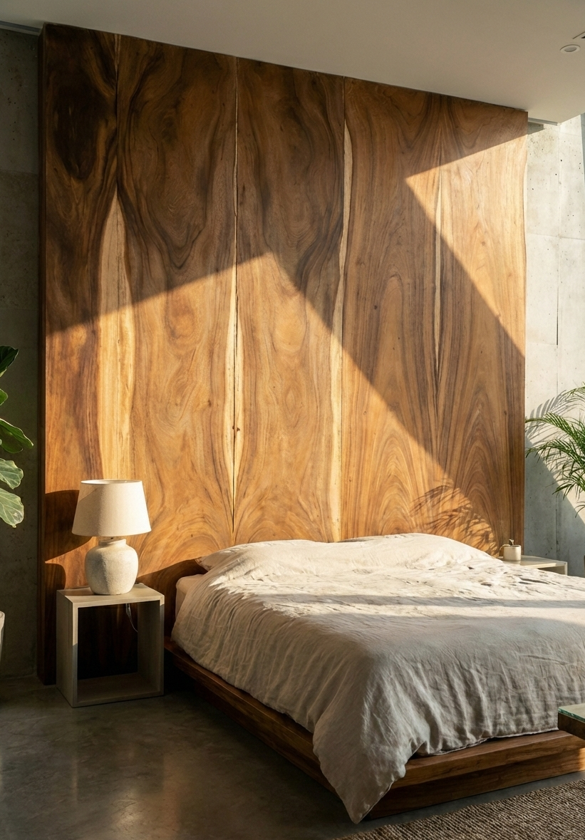 Cabecero con friso a medida de teca o suar. La belleza de la madera en estado puro.