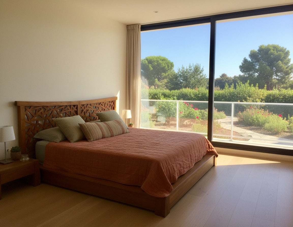 Cama asiática-colonial de teca maciza con celosía indonesa que combina elegancia y autenticidad. Diseño a medida que se adapta perfectamente a tu espacio, permitiéndote elegir el color que mejor complemente tu decoración. La madera de teca garantiza durabilidad y una belleza natural que envejece con distinción. Cada pieza es original, reflejando la artesanía tradicional de Indonesia. Transforma tu dormitorio en un refugio exótico con esta cama de carácter único que fusiona estilo colonial con la calidez de la madera noble.