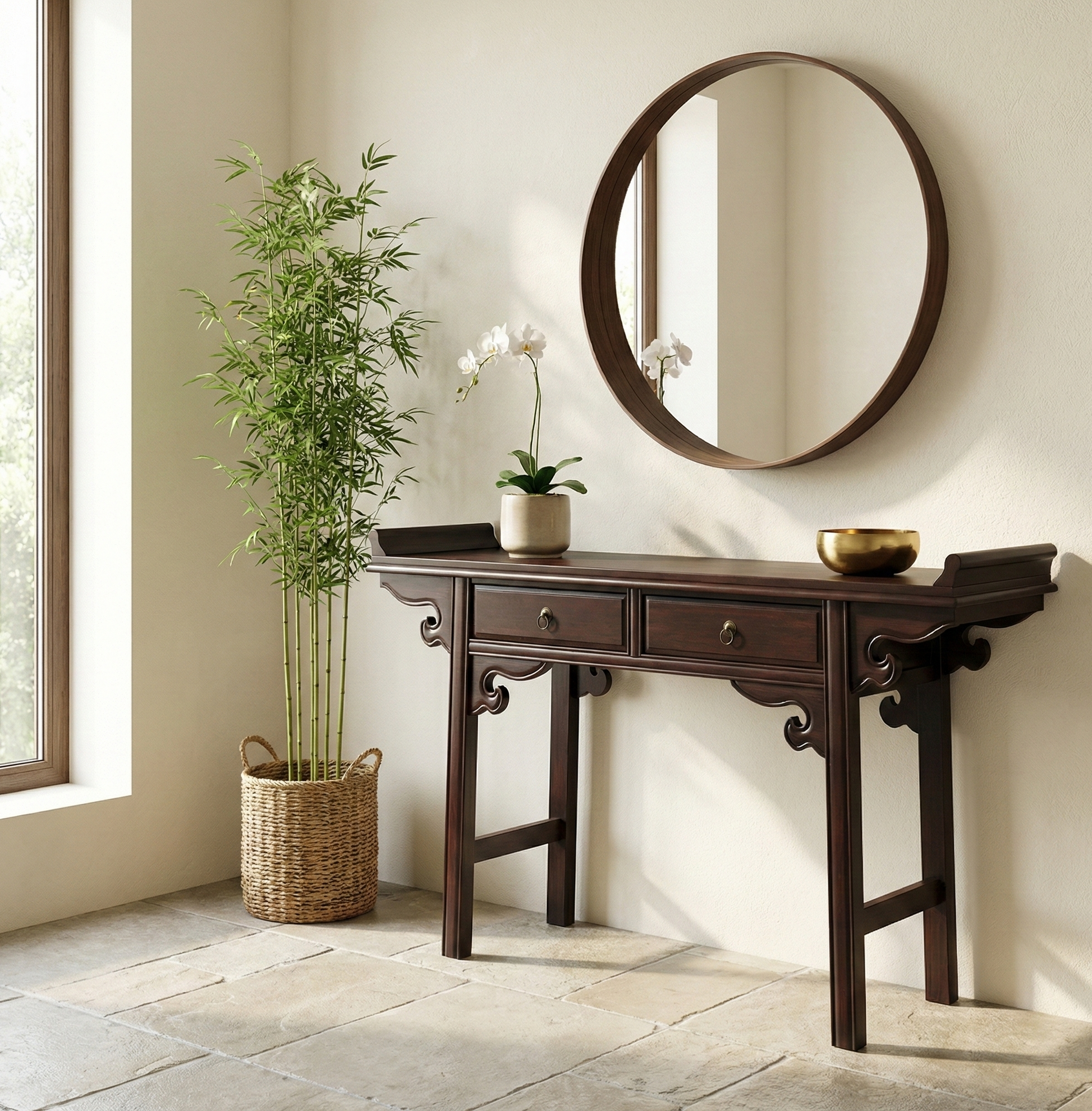 Consola colonial asiática de teca maciza que encarna la elegancia milenaria del diseño chino. Tallada artesanalmente con precisión, combina la robustez de la teca con detalles ornamentales que reflejan la sofisticación oriental. Completamente personalizable a tus medidas, se integra armónicamente en cualquier ambiente, desde espacios clásicos hasta contemporáneos. Su presencia noble y su acabado natural confieren carácter y distinción a recibidores, salones o dormitorios. Una inversión en autenticidad que trasciende tendencias, aportando profundidad cultural y calidez a tu hogar con la garantía de durabilidad que solo ofrece la madera de teca.
