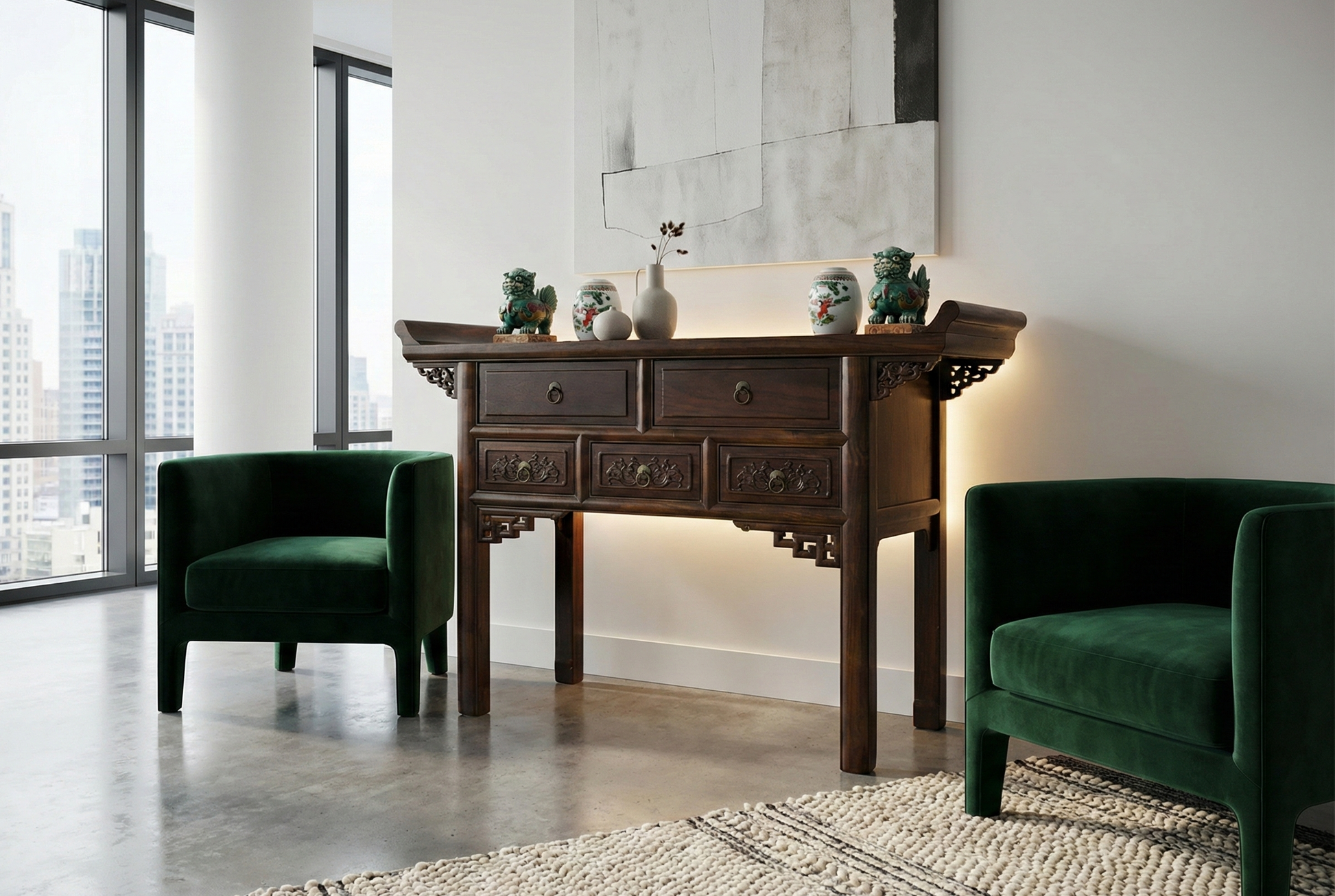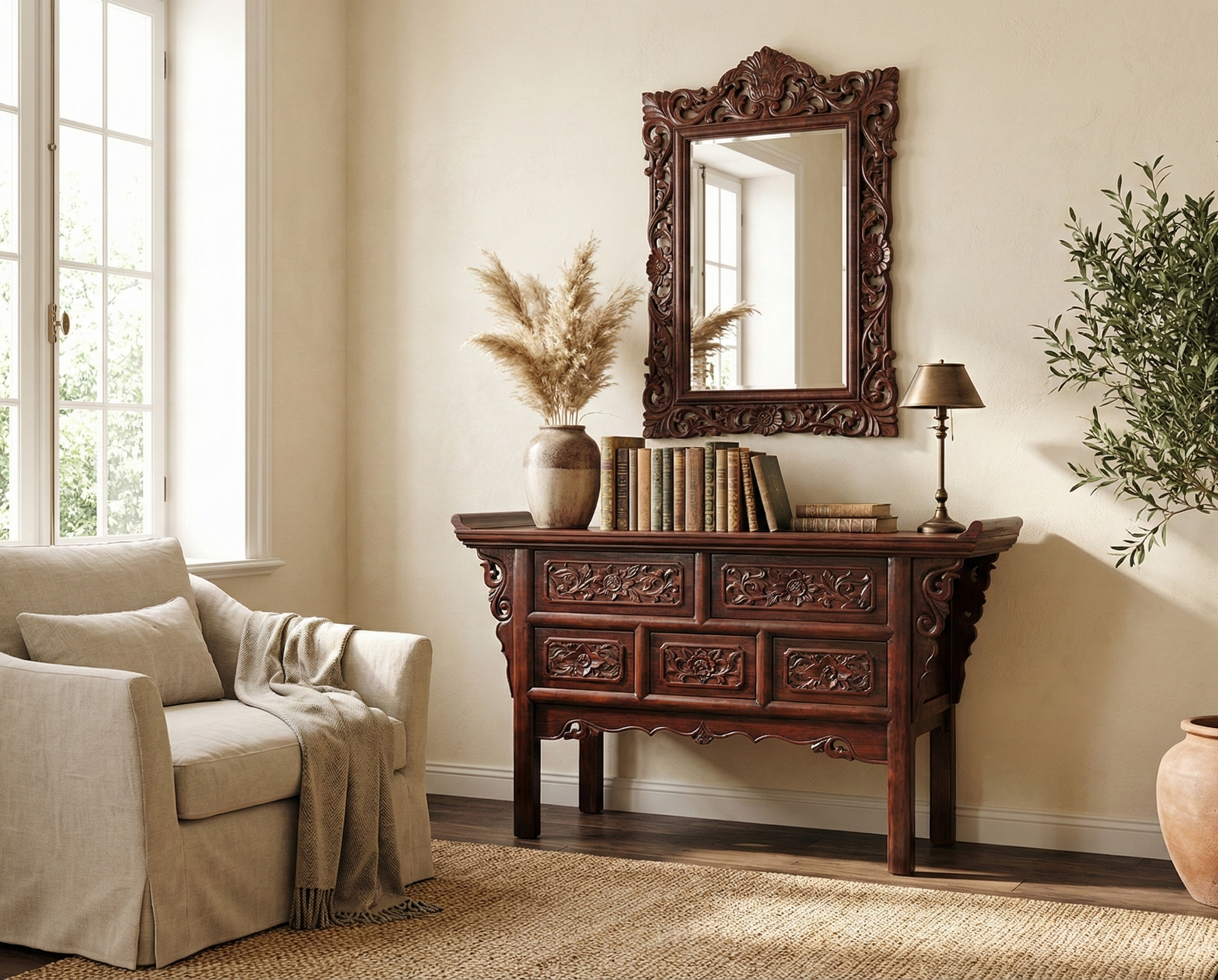 Consola colonial asiática de teca maciza que reinterpreta la tradición china con autenticidad y refinamiento. Construida con madera noble de gran resistencia, presenta proporciones equilibradas y detalles decorativos que evocan la sabiduría oriental. Diseñada a medida para adaptarse a tus espacios específicos, ofrece funcionalidad sin comprometer la estética. Perfecta para crear puntos focales en entradas, salones o dormitorios, esta consola transmite serenidad y elegancia. Su acabado natural y estructura sólida garantizan una pieza duradera que envejece con gracia, convirtiéndose en un tesoro familiar que enriquece tu hogar con carácter y autenticidad cultural.