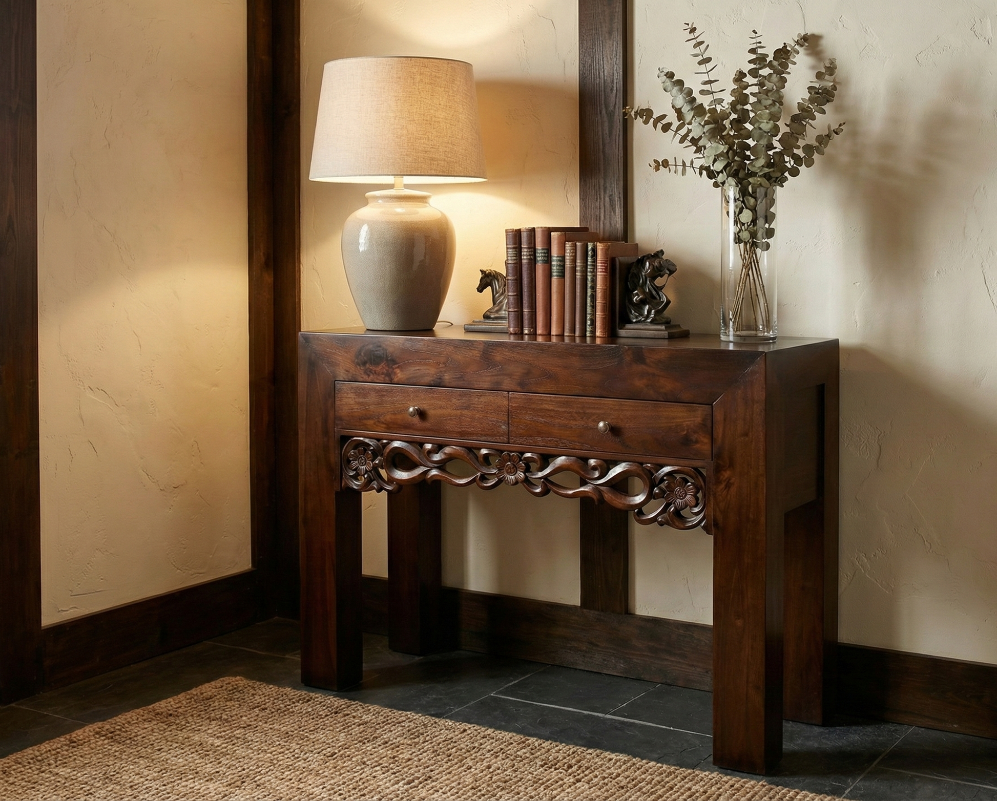 Personaliza tu espacio con esta consola colonial asiática, una creación artesanal confeccionada íntegramente en teca maciza. Diseñada completamente a medida, se ajusta a tus necesidades específicas en dimensiones y acabados cromáticos. Su estructura robusta y elegante refleja la tradición oriental más auténtica, aportando sofisticación y calidez a cualquier ambiente. La calidad superior de la madera noble garantiza resistencia y belleza que perduran en el tiempo. Un mueble versátil que transforma espacios, combinando funcionalidad con diseño atemporal para quienes valoran la autenticidad y la excelencia.