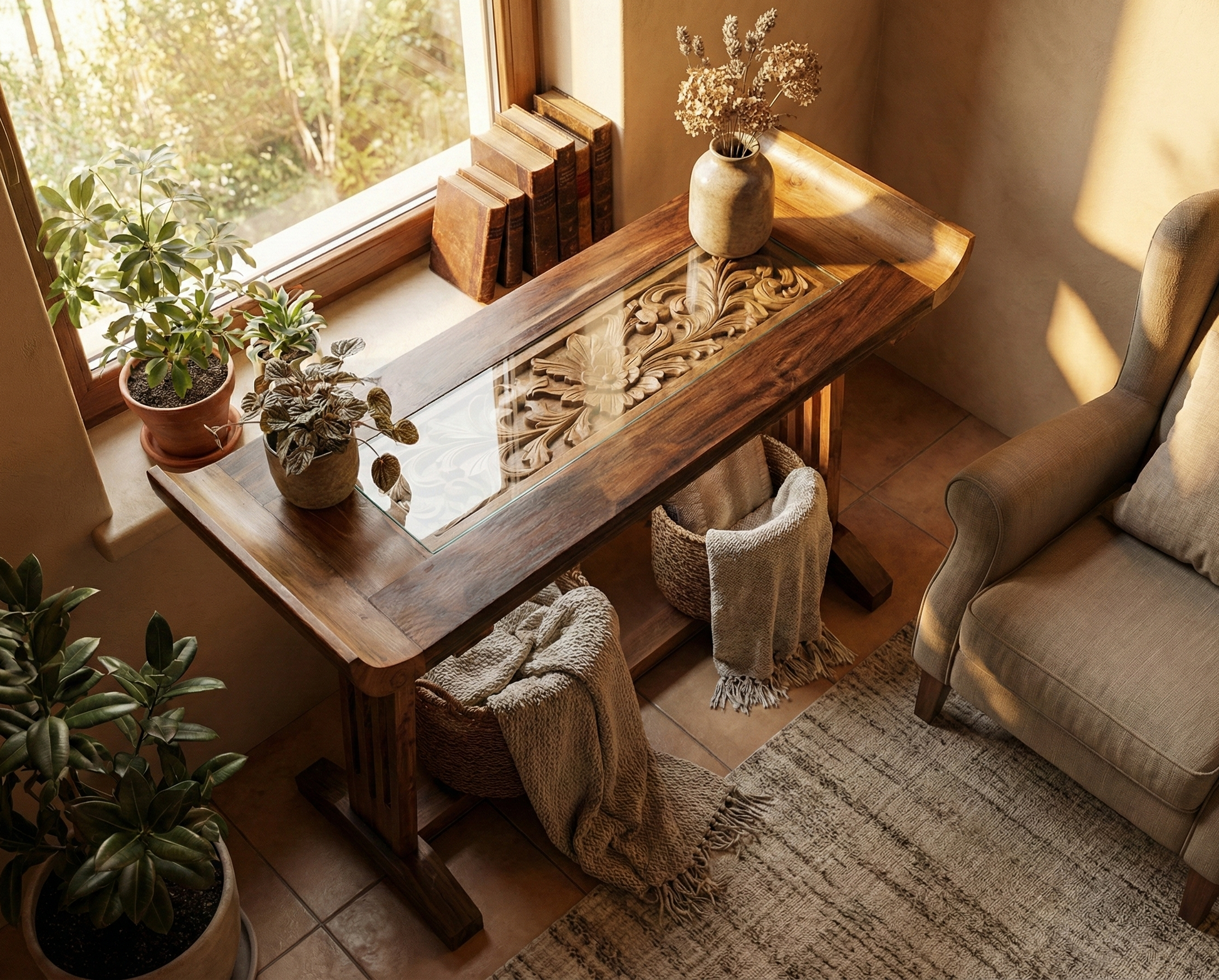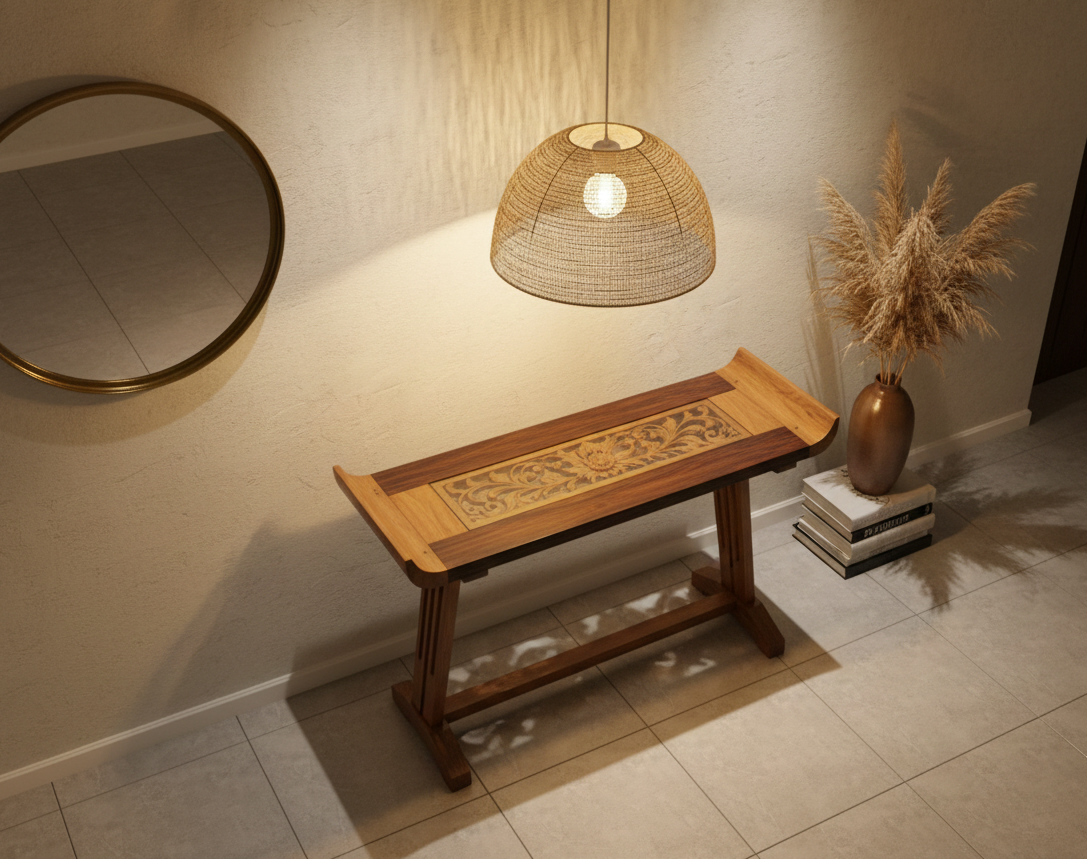 Consola colonial asiática confeccionada en teca maciza con tapa tallada artesanalmente, un detalle que refleja la autenticidad de la craftsmanship oriental. Cada pieza es única gracias a su elaboración manual y personalizable según tus medidas exactas. La riqueza de sus tallas y la calidez natural de la teca crean una atmósfera de distinción y refinamiento en cualquier ambiente. Ideal para quienes buscan muebles con historia y carácter, esta consola combina funcionalidad práctica con una belleza atemporal. Su construcción sólida garantiza durabilidad generacional, convirtiéndola en una inversión que trasciende las tendencias pasajeras.