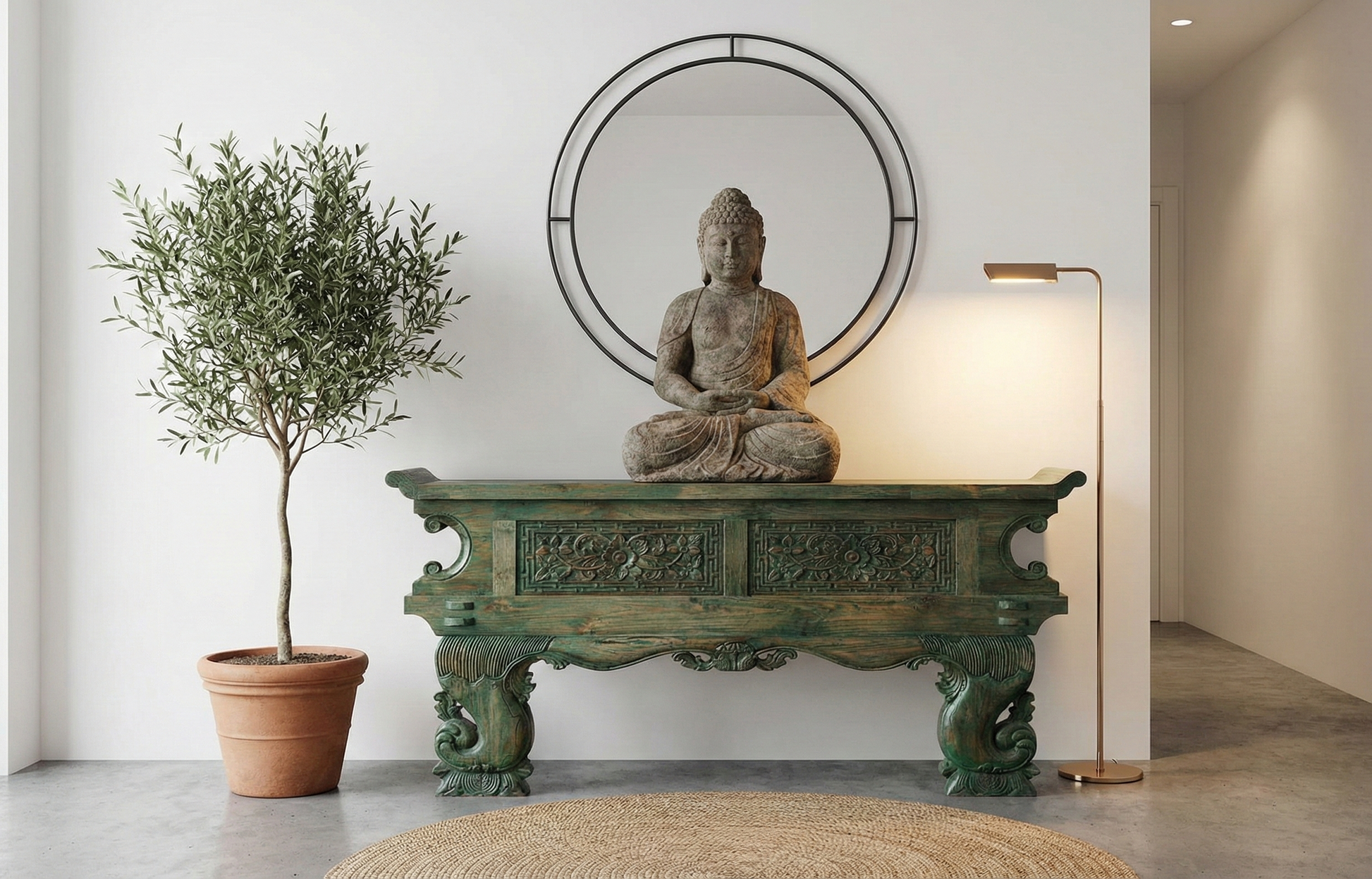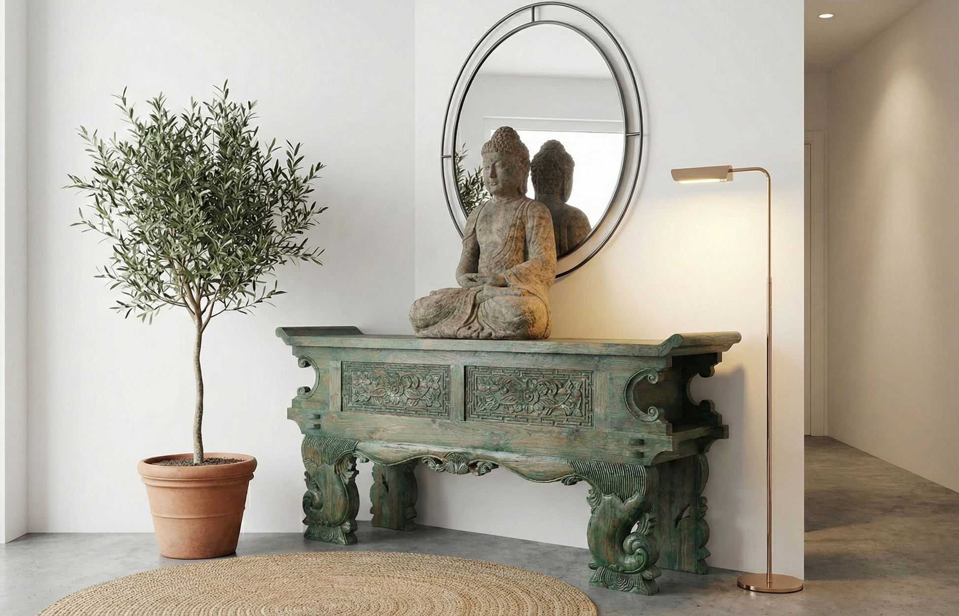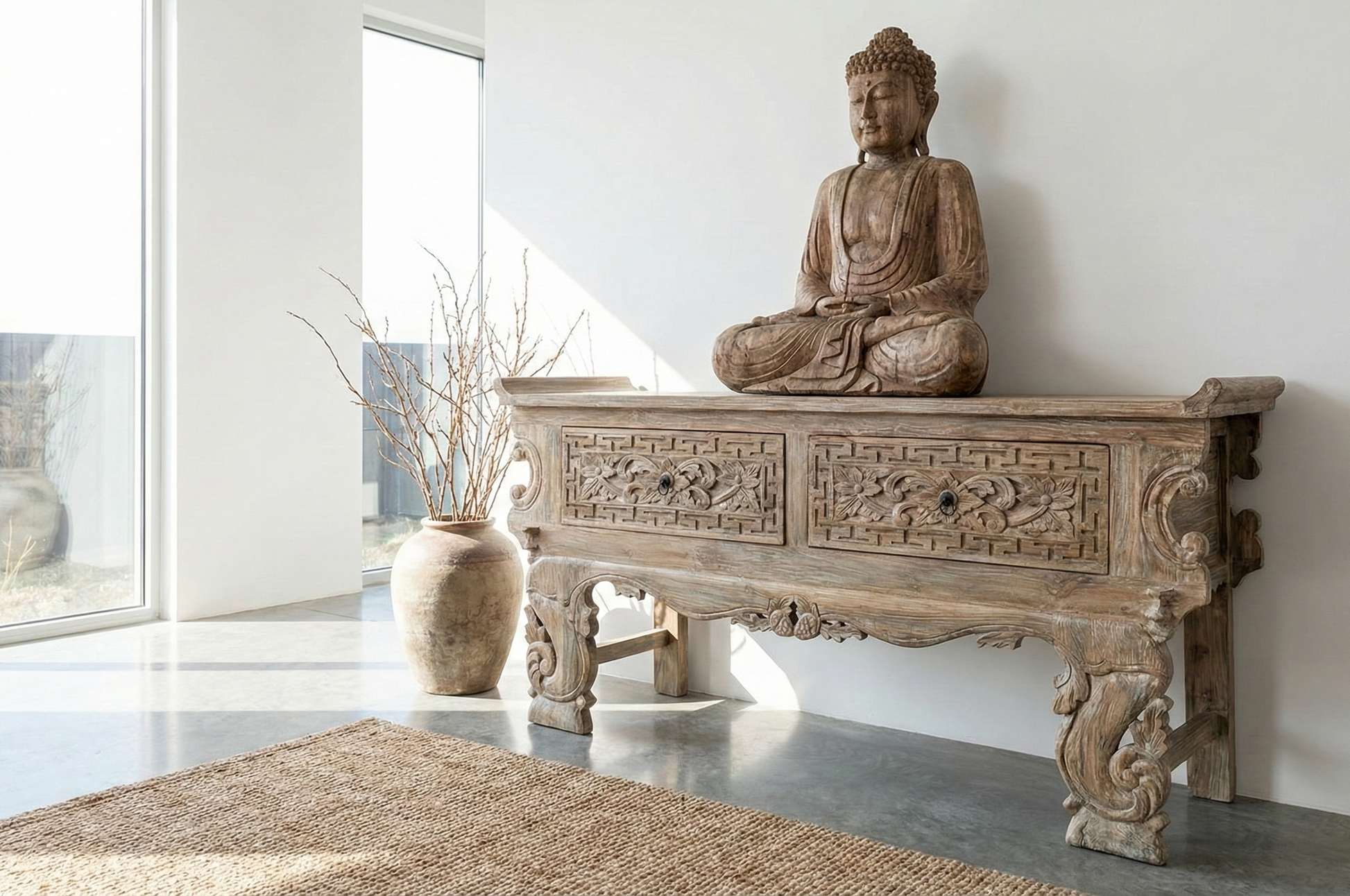 Consola colonial asiática de teca javanesa maciza, diseñada a medida para adaptarse perfectamente a tu espacio. Este mueble artesanal combina la elegancia del estilo colonial con la calidez natural de la madera de teca, reconocida por su durabilidad y belleza atemporal. Cada pieza es única, elaborada con técnicas tradicionales que garantizan calidad excepcional. Ideal para crear un ambiente sofisticado y acogedor en tu hogar, esta consola es una inversión en estilo y funcionalidad que perdurará generaciones.