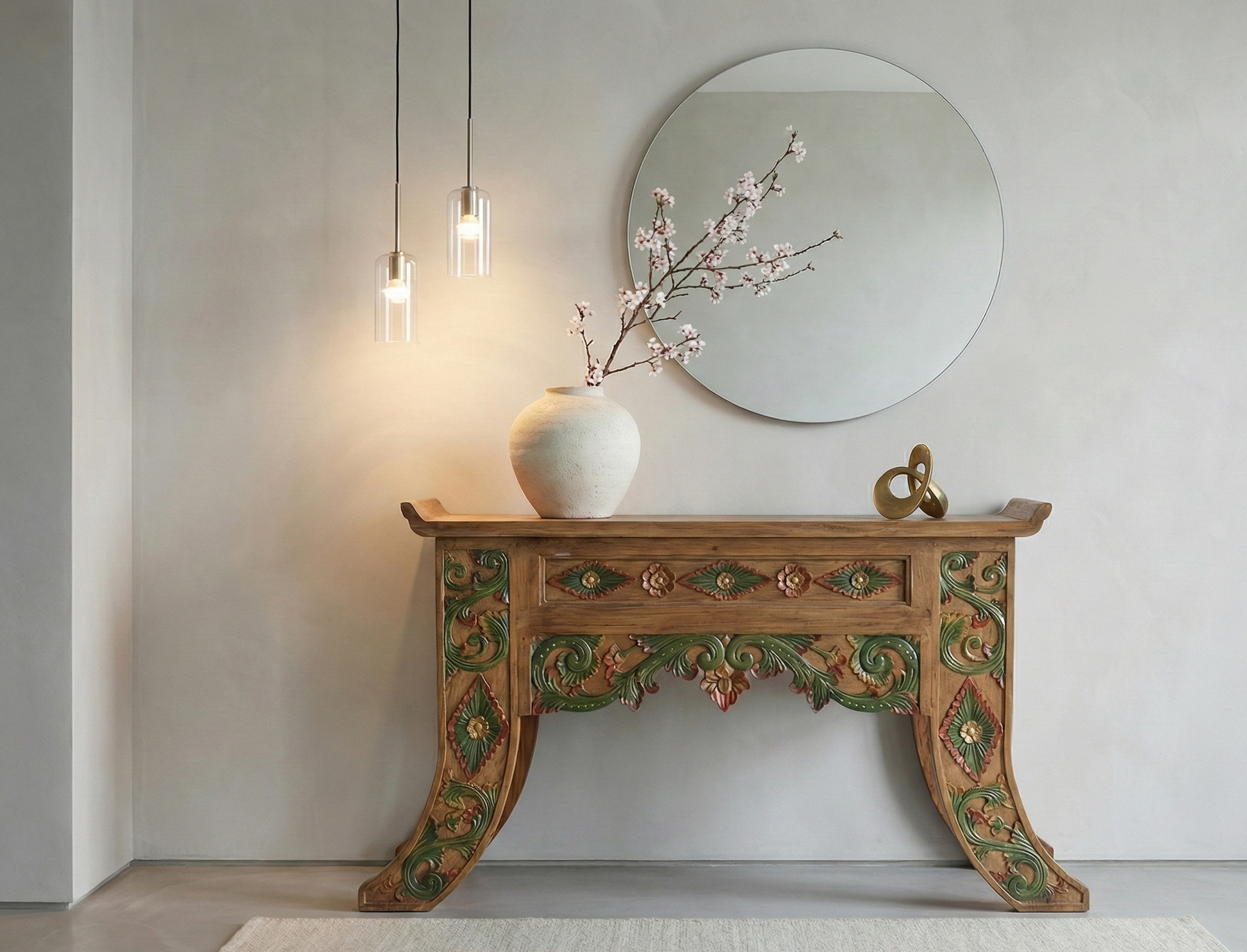 Consola estilo asiático-colonial a medida. Consola de estilo colonial-asiático fabricada artesanalmente en madera. Disponible en cualquier medida y color.