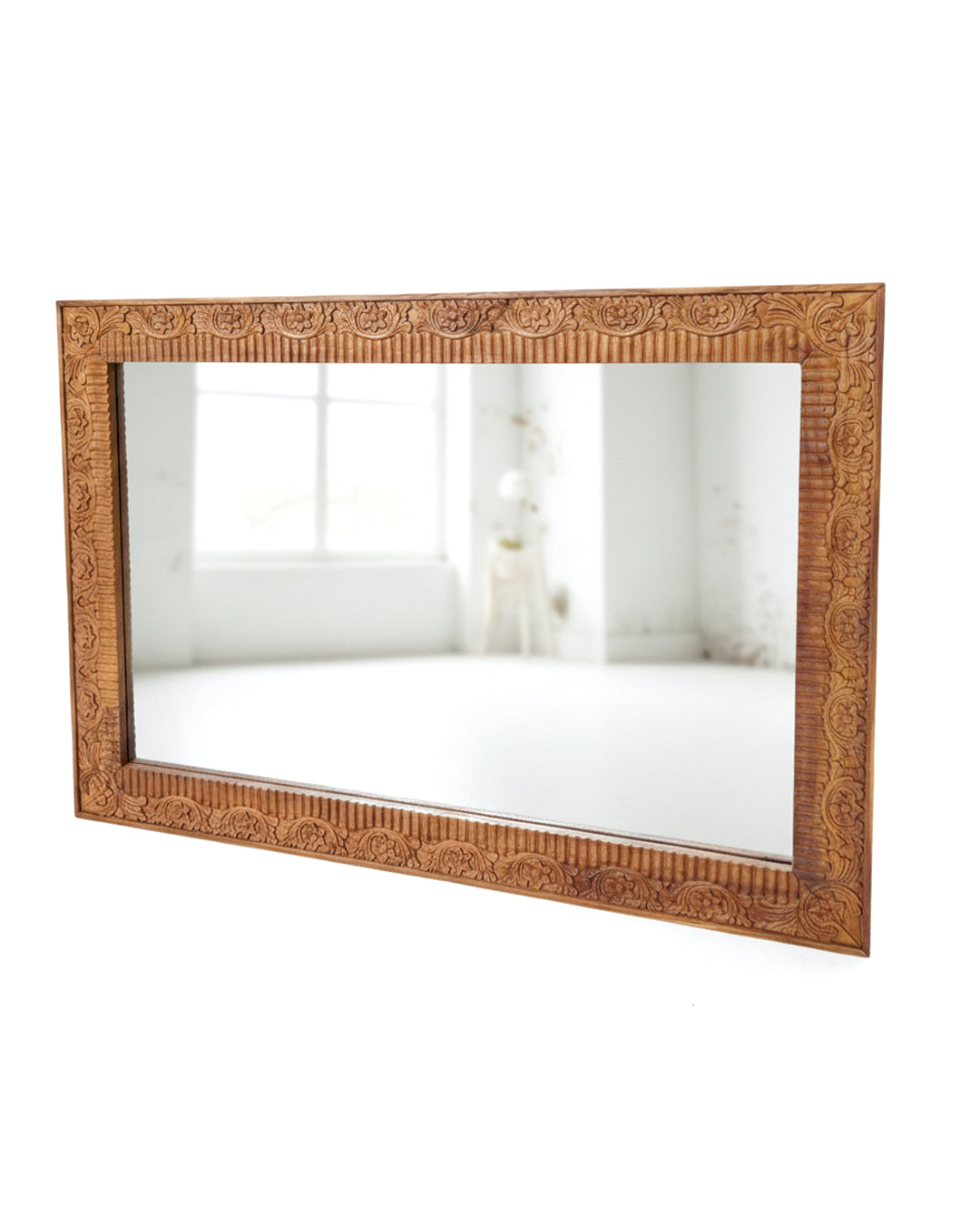 Espejo artesanal elaborado en teca maciza con talla manual que confiere carácter único a cada pieza. El marco tallado a mano presenta detalles ornamentales que reflejan la maestría del artesano, mientras que la madera de teca garantiza durabilidad y resistencia al paso del tiempo. Disponible a medida para adaptarse perfectamente a tus espacios. Ideal para crear puntos focales decorativos en salones, dormitorios o baños con un toque de elegancia natural y autenticidad artesanal.