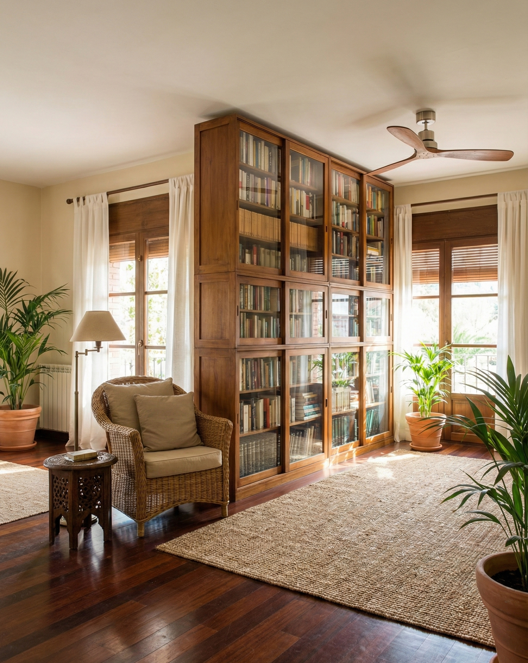 Librería a medida AM-14487. Librería de estilo colonial-asiático fabricada artesanalmente en madera de teca. Disponible en cualquier color y medida. Posibilidad de cambiar disposición de puertas y cajones.
