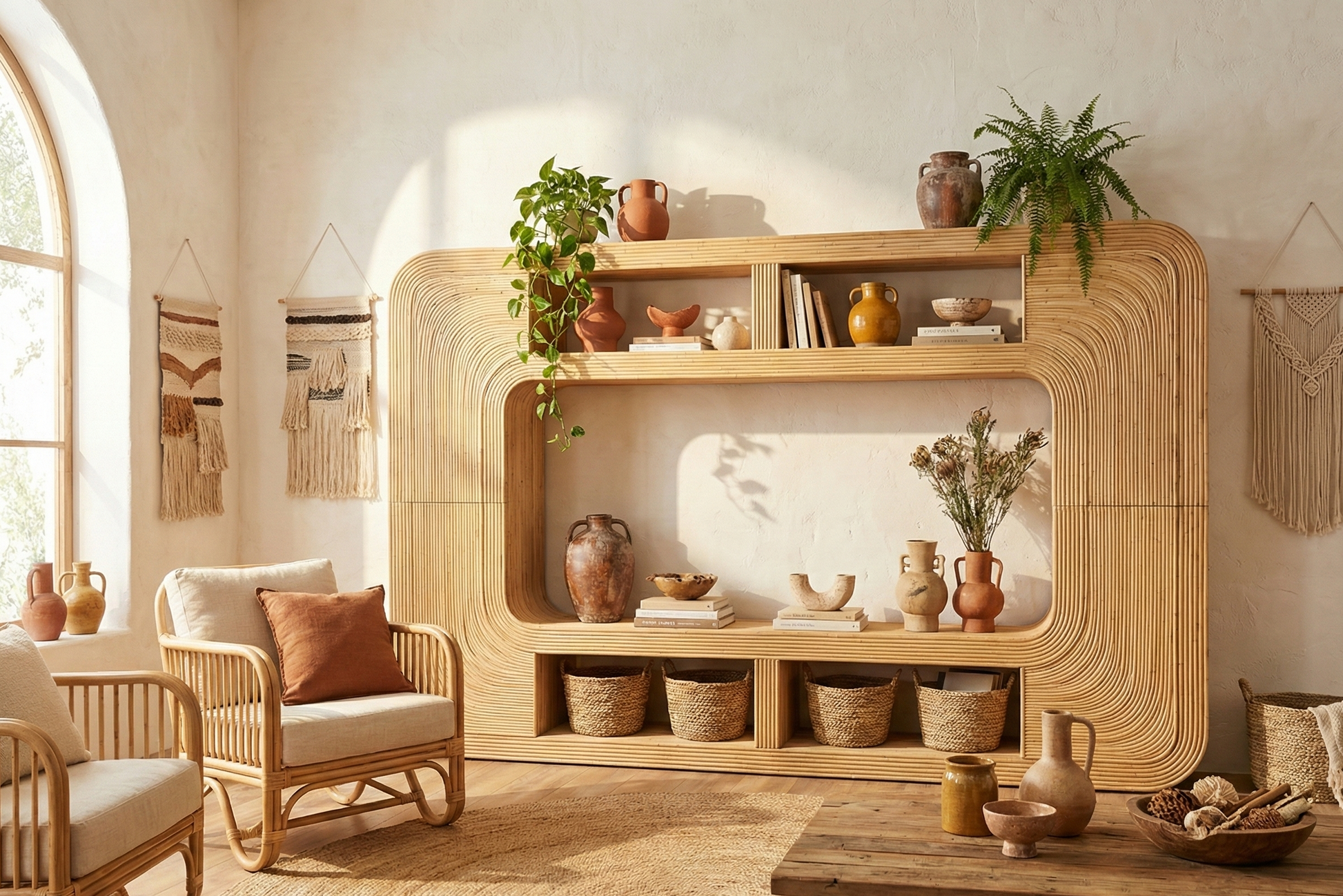 Libreria de rattan natural con puertas ocultas . Moderna y autentica sin perder el gusto asiatico.