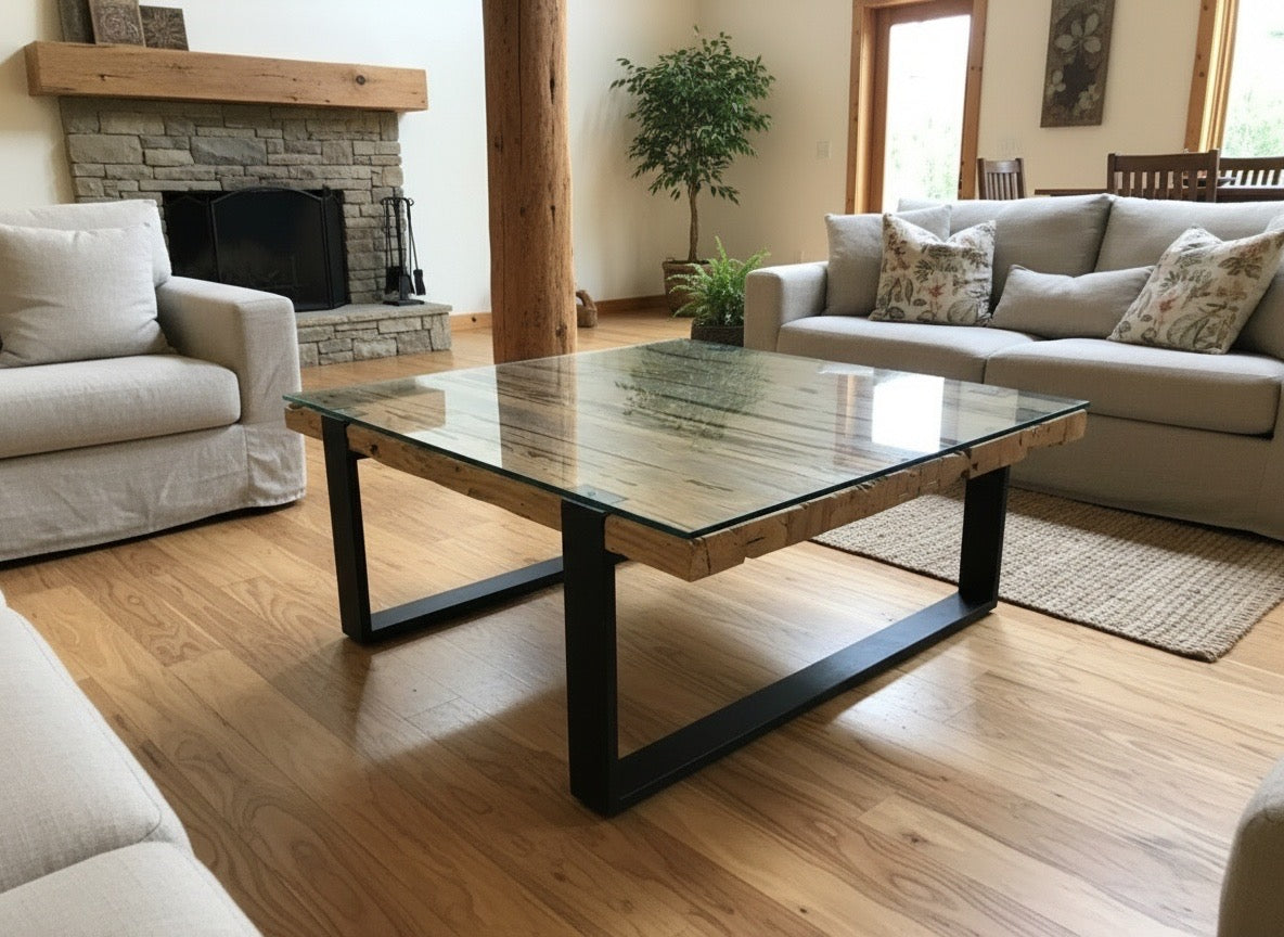 Mesa centro a medida en teca maciza reciclada, cristal protector y patas metálicas.