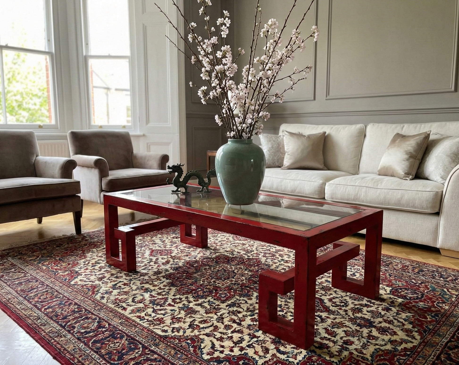 Mesa centro colonial asiática a medida en teca y cristal AM202208041938