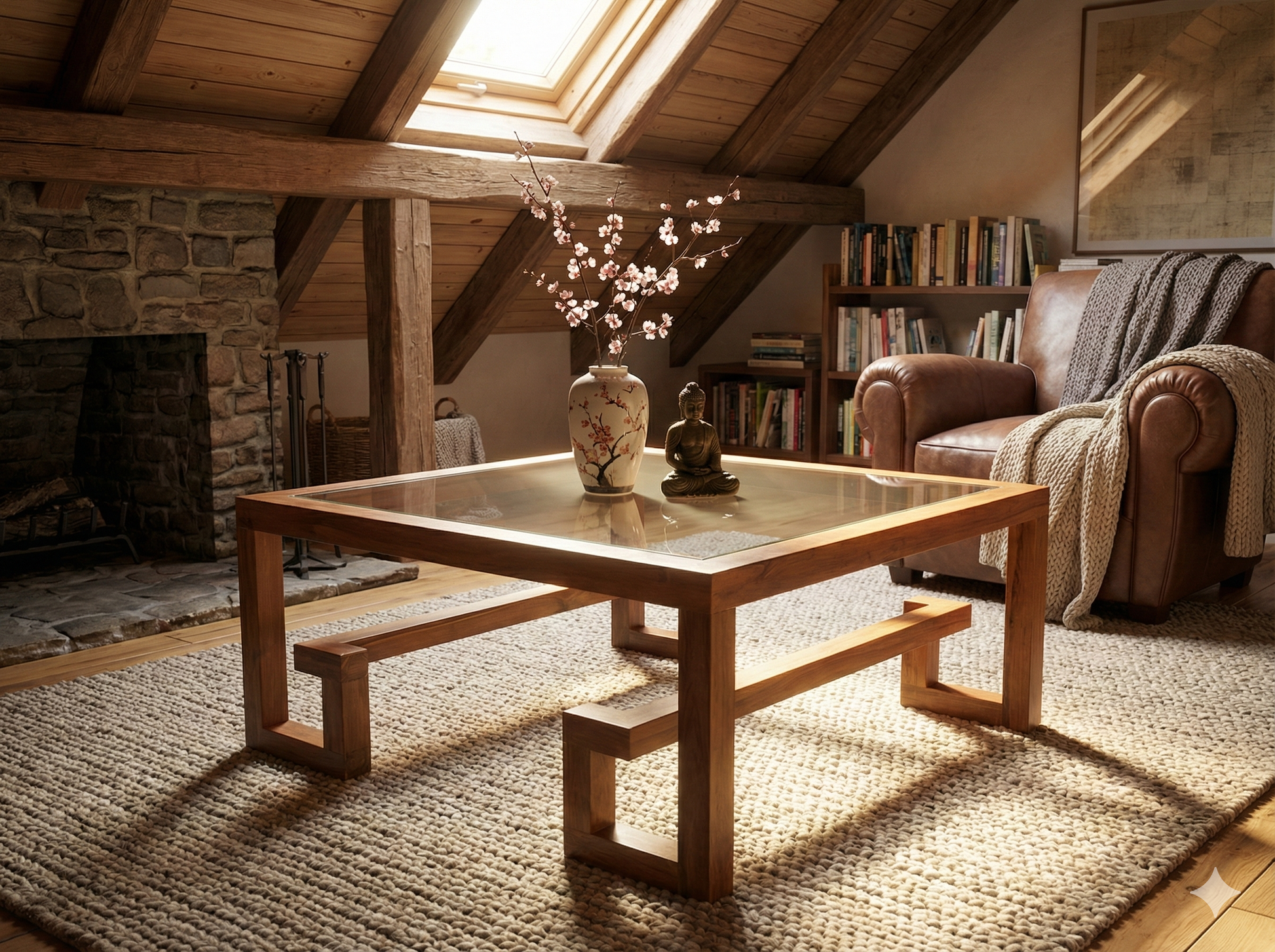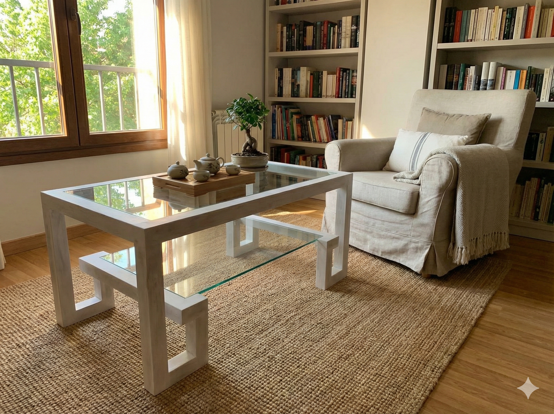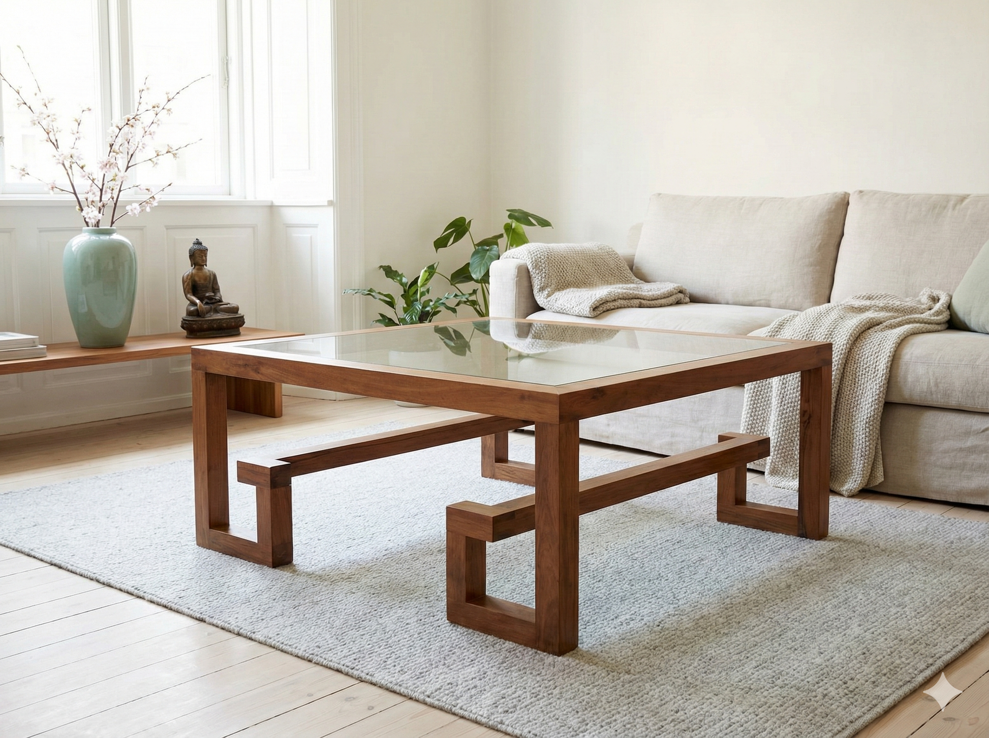 Mesa centro a medida en teca y cristal salón AM202208041938. Mesa de centro de estilo colonial-asiático fabricada artesanalmente en madera de teca y cristal. Diseño de líneas modernas. Disponibilidad en otras medidas y colores.