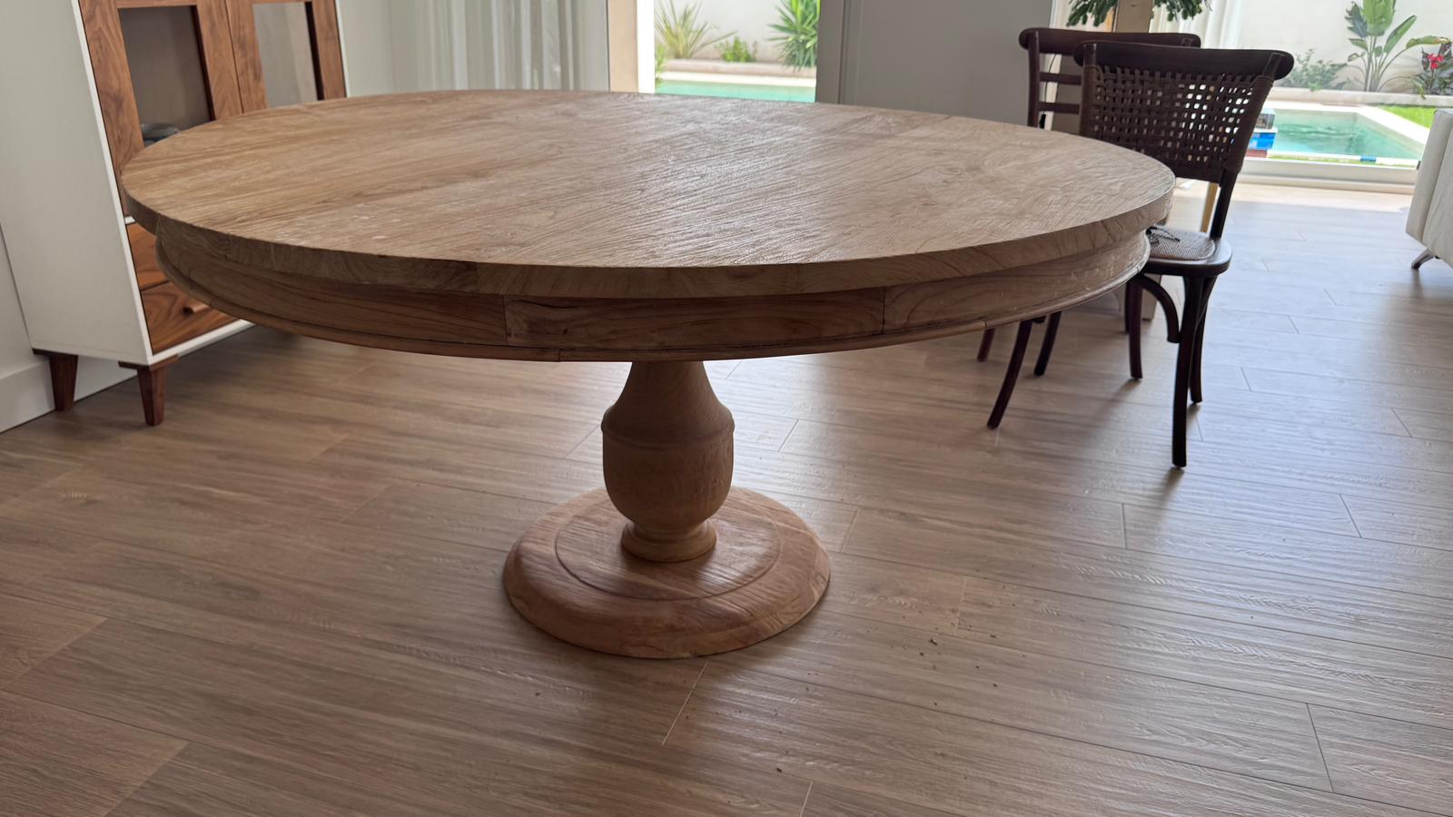 Mesa circular colonial , en teca, a medida, con posibilidad de extensión.