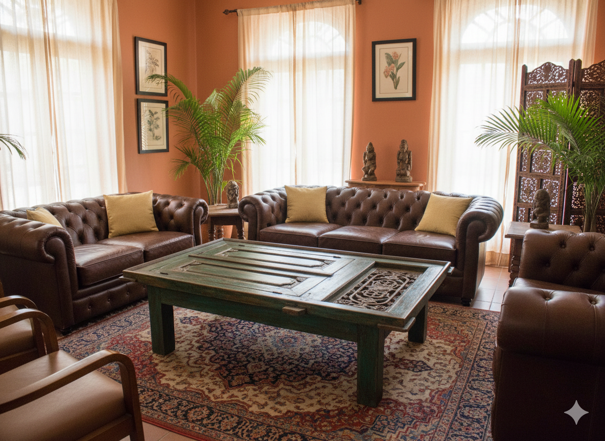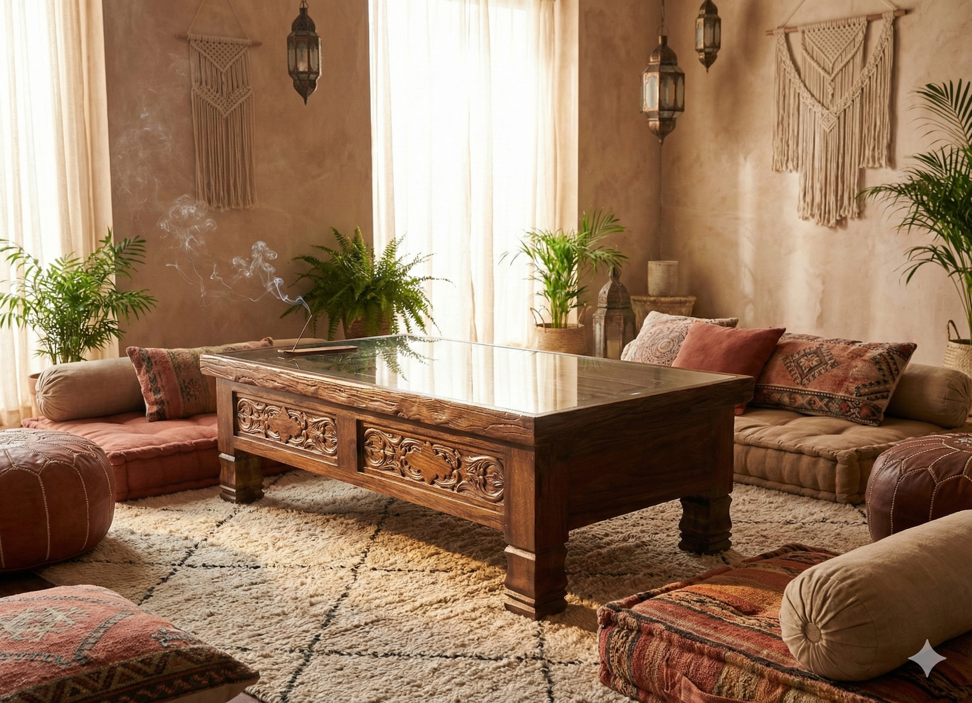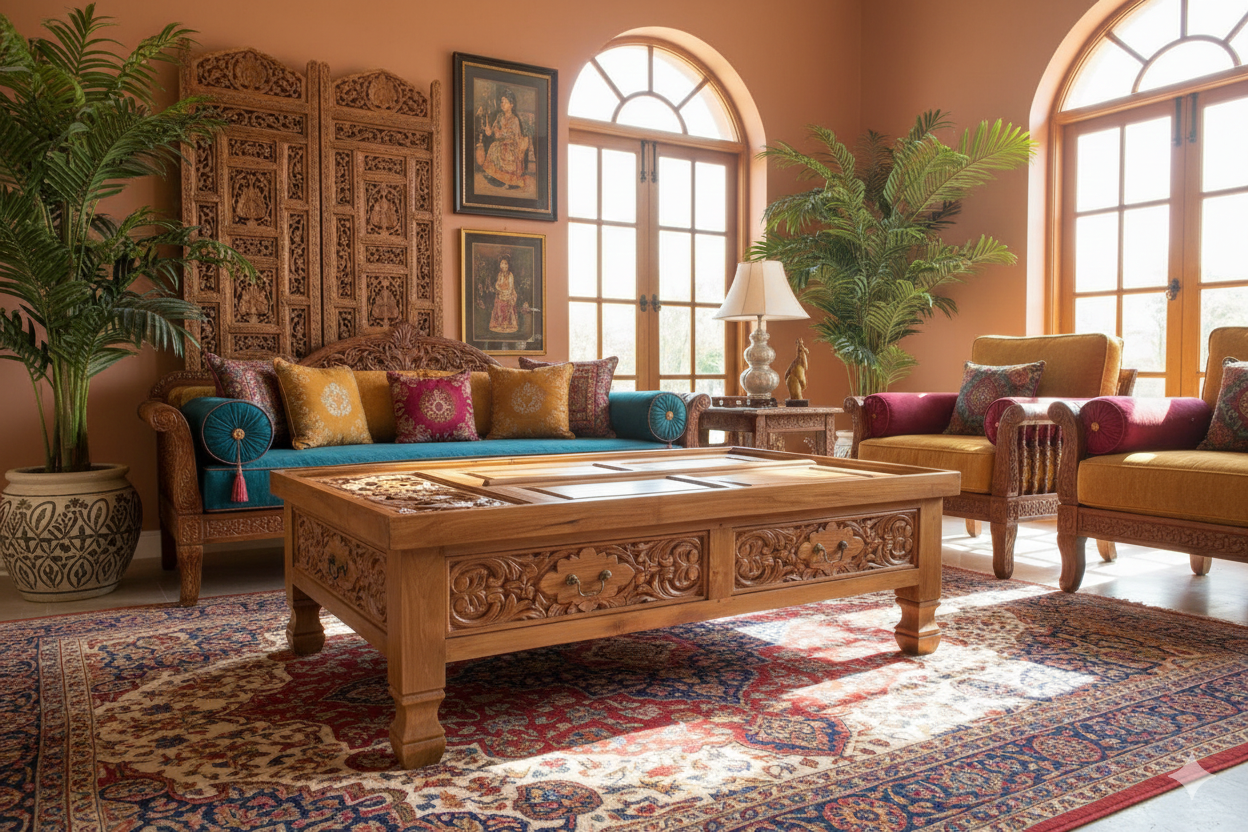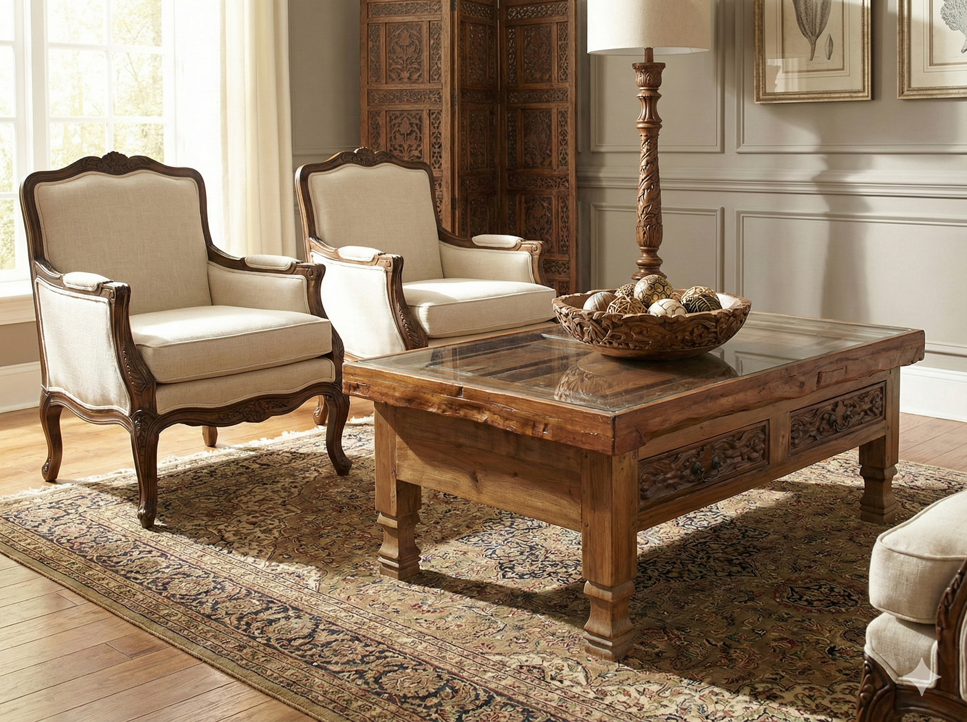 Transforma tu sala con esta mesa de centro colonial-asiática que reinterpreta el virtuosismo de las puertas y ventanas indias e indonesias en un mueble funcional de extraordinaria belleza. Sus paneles ornamentales, tallados con precisión artesanal, revelan la destreza de maestros que dominan técnicas milenarias de carpintería. Fabricada en teca maciza, cada detalle grabado crea juegos de luz y sombra que evolucionan a lo largo del día, añadiendo dinamismo visual a tu espacio. Los patrones geométricos y florales evocan la riqueza cultural de Asia, convirtiéndola en una conversación permanente. Personaliza completamente tu compra: selecciona medidas y acabados para lograr la integración perfecta.