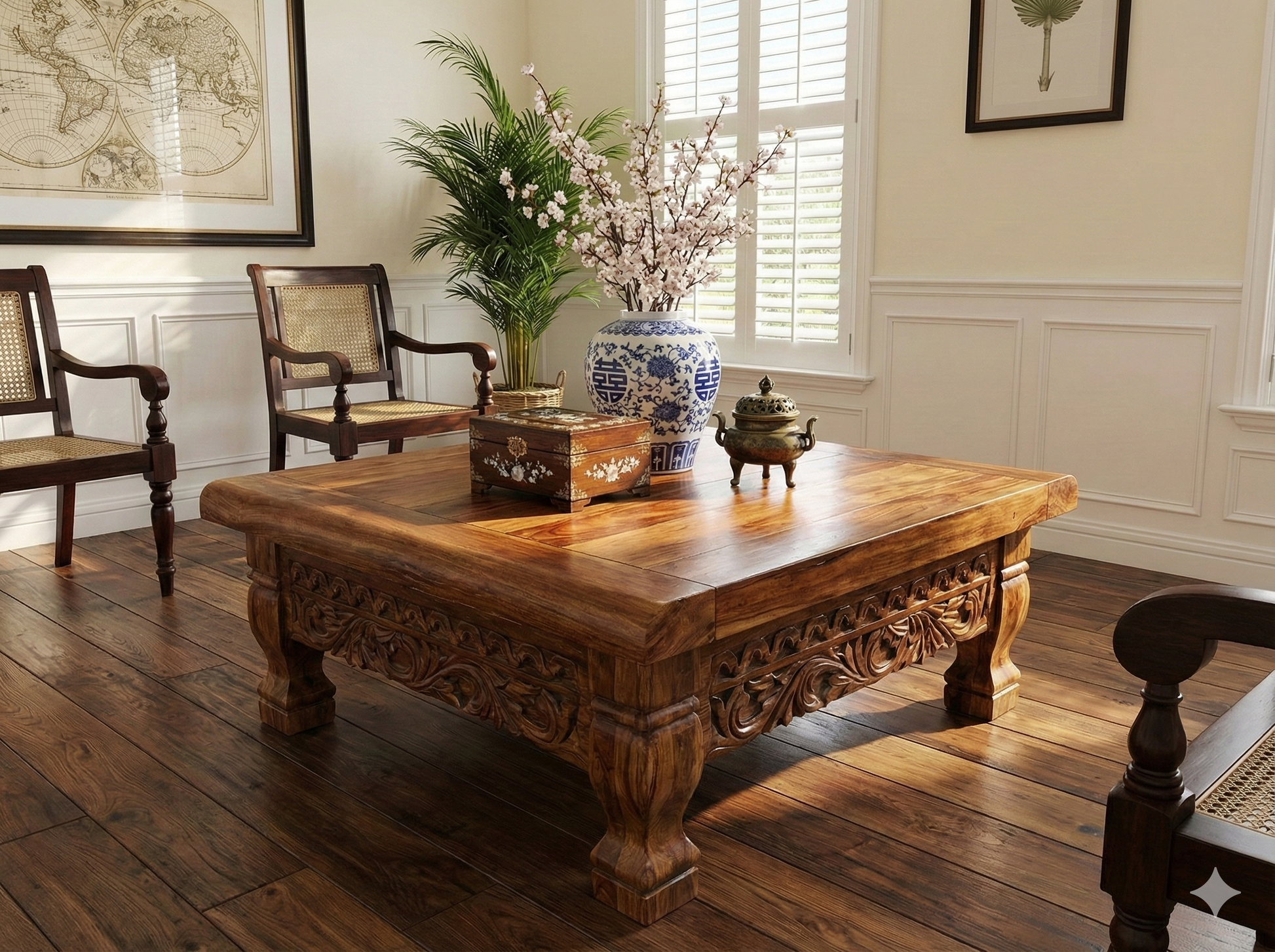 Sumérgete en la riqueza artesanal de la India con esta mesa de centro colonial-asiática tallada en teca maciza. Sus grabados preciosistas revelan la destreza de maestros artesanos que dominan técnicas milenarias, transformando cada superficie en una galería de arte miniaturista. Los detalles meticulosamente esculpidos crean texturas que juegan con la luz, añadiendo profundidad y movimiento visual a tu espacio. Fabricada completamente a medida, puedes personalizar cada dimensión y tonalidad para lograr la pieza que refleje tu visión única.