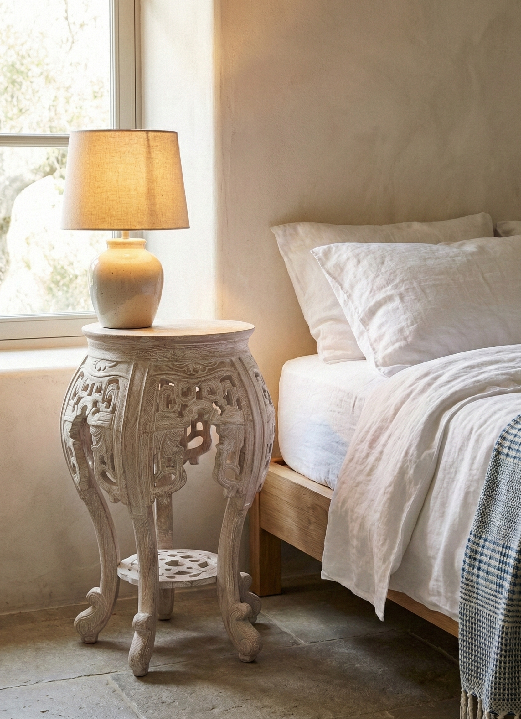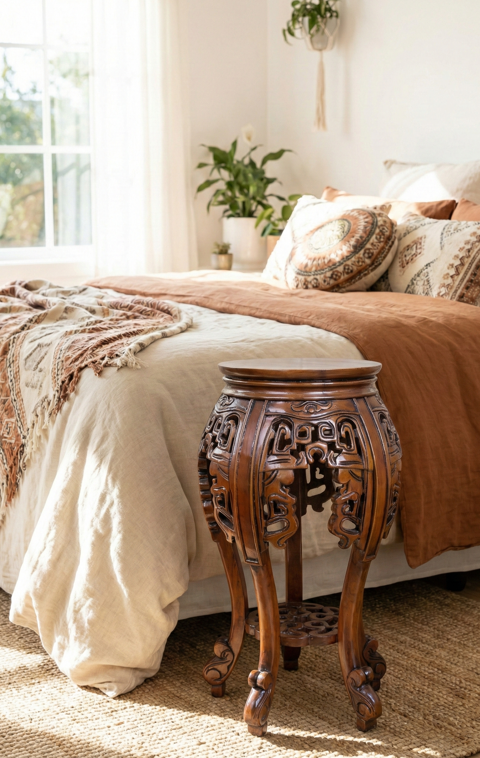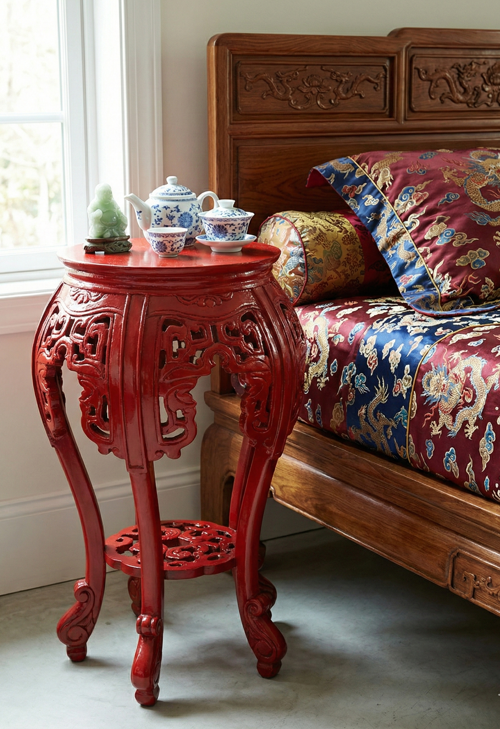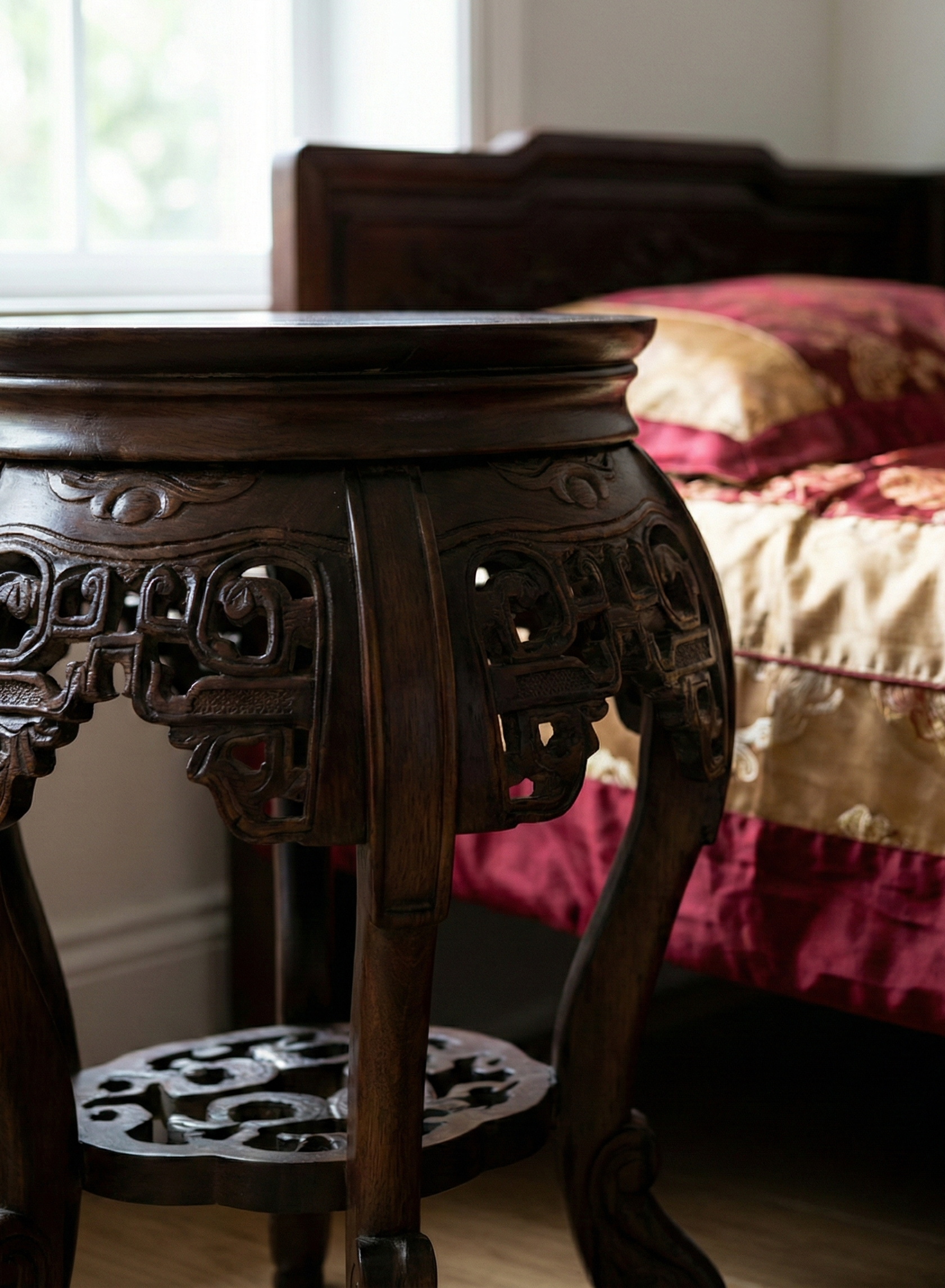 Mesilla velador de diseño oriental que combina artesanía tradicional con funcionalidad contemporánea. Cada pieza es tallada a mano, garantizando detalles únicos y exclusivos que reflejan la elegancia característica del mobiliario asiático. Su construcción personalizada permite adaptarse a tus espacios específicos, mientras que los motivos tallados aportan personalidad y sofisticación a cualquier dormitorio. Un mueble que trasciende lo decorativo para convertirse en una declaración de estilo y buen gusto.