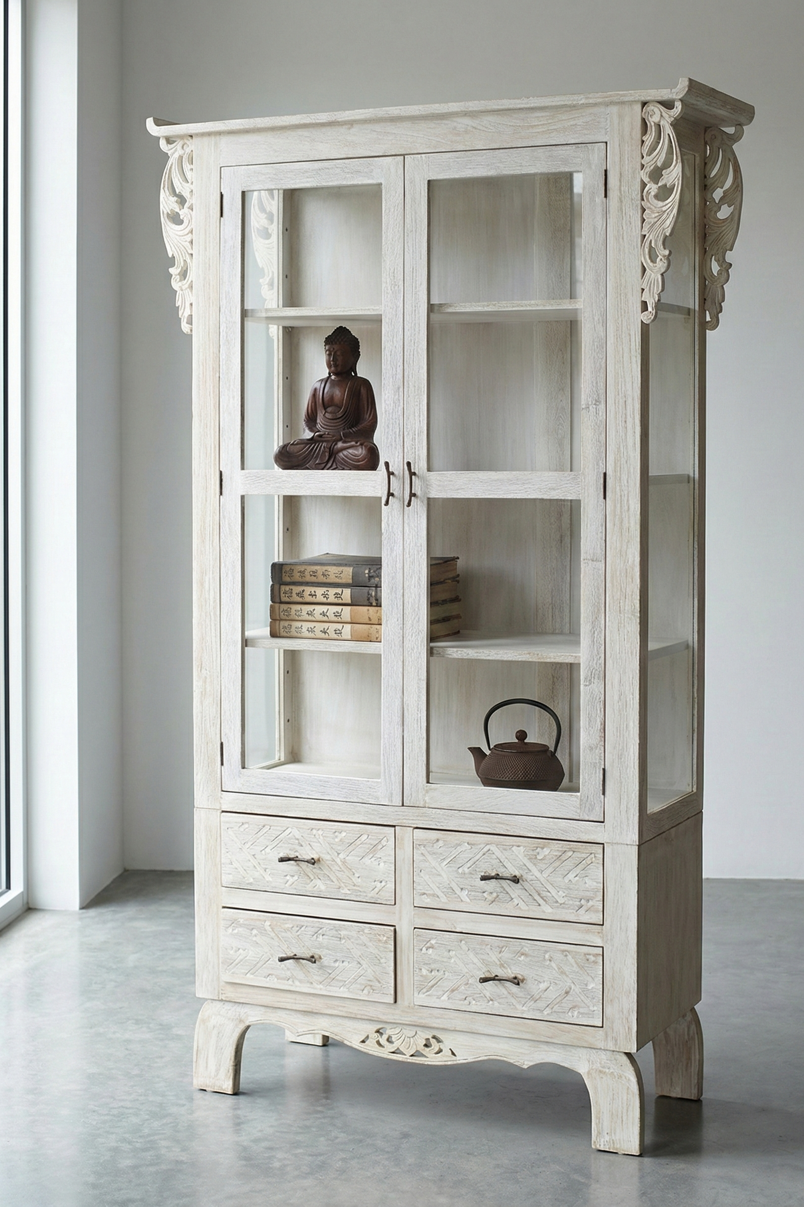 Vitrina a medida en madera de teca decapado – AM-14383. Vitrina de estilo colonial-asiático fabricada artesanalmente en madera de teca . Disponible en cualquier color y medida. Posibilidad de cambiar disposición de puertas y cajones.