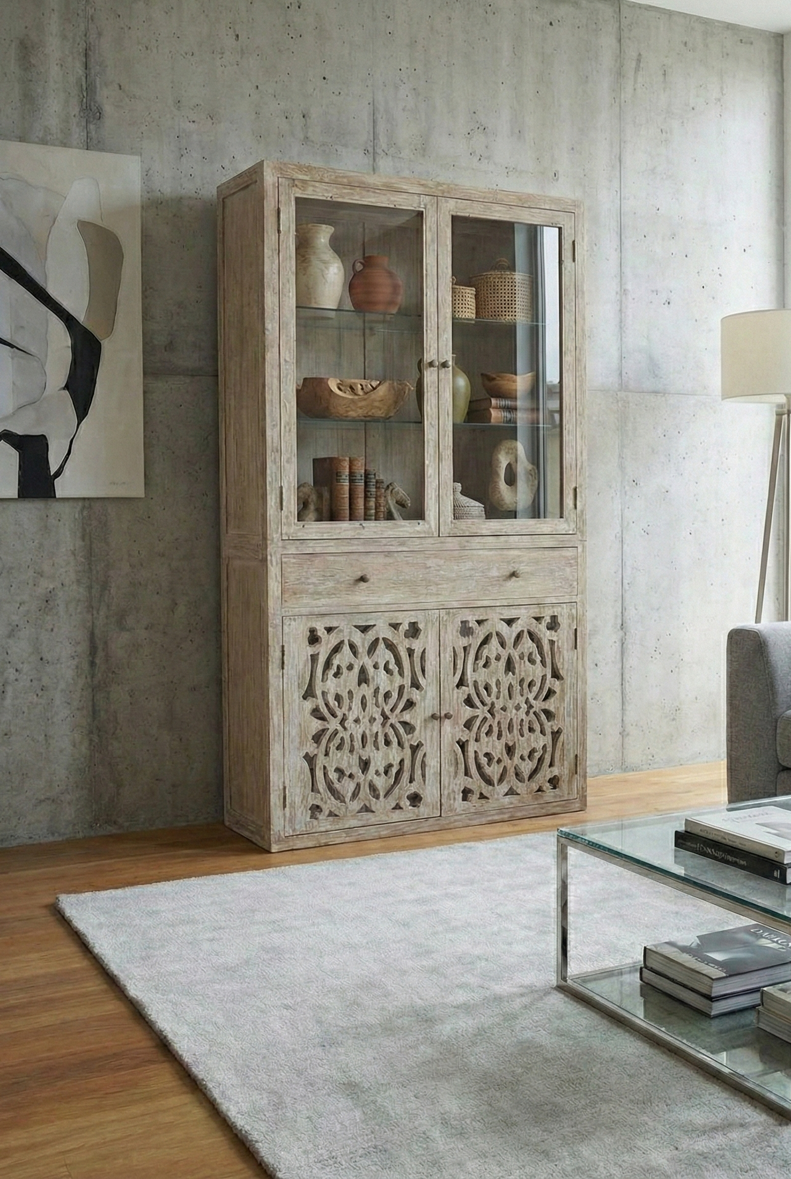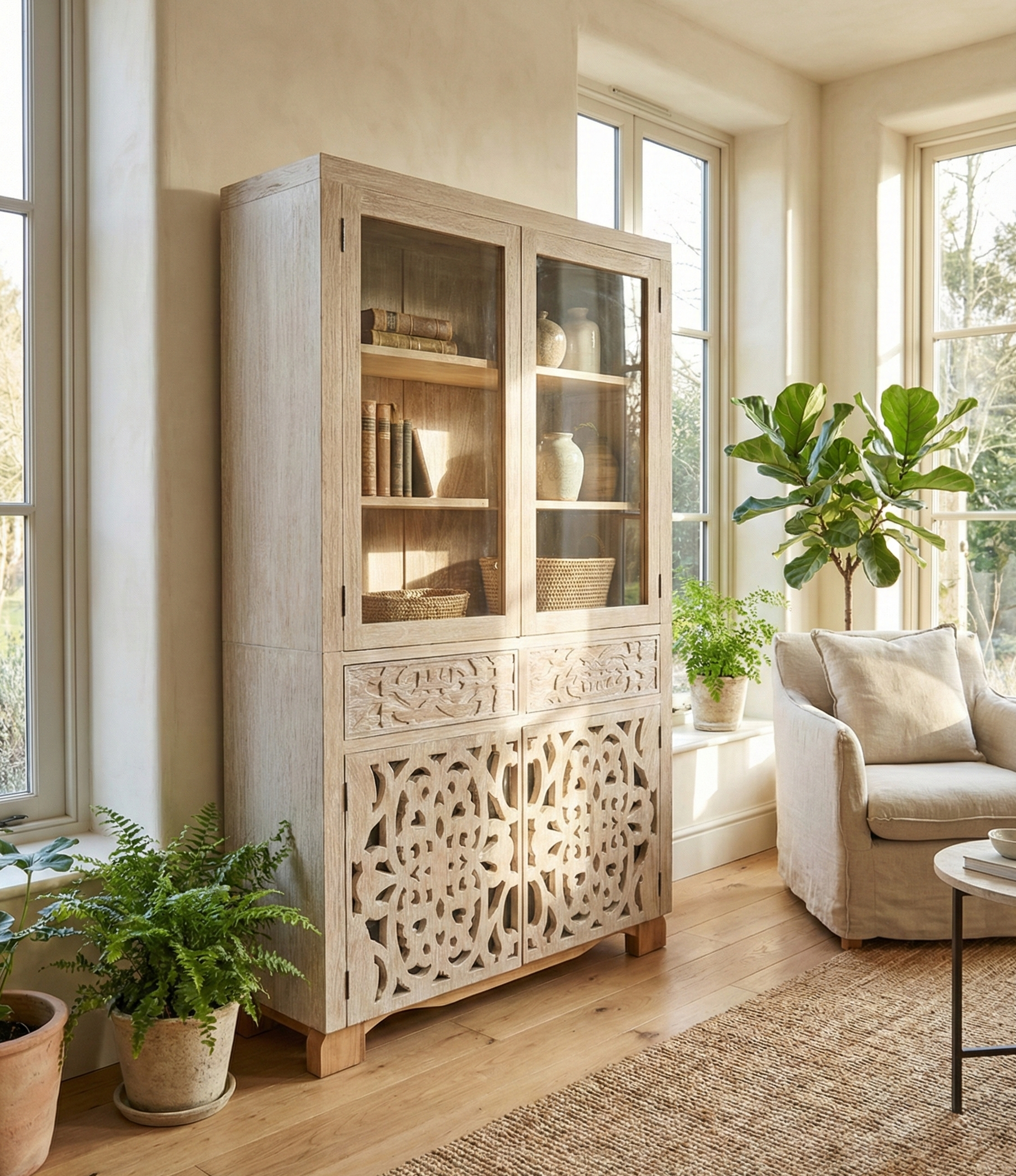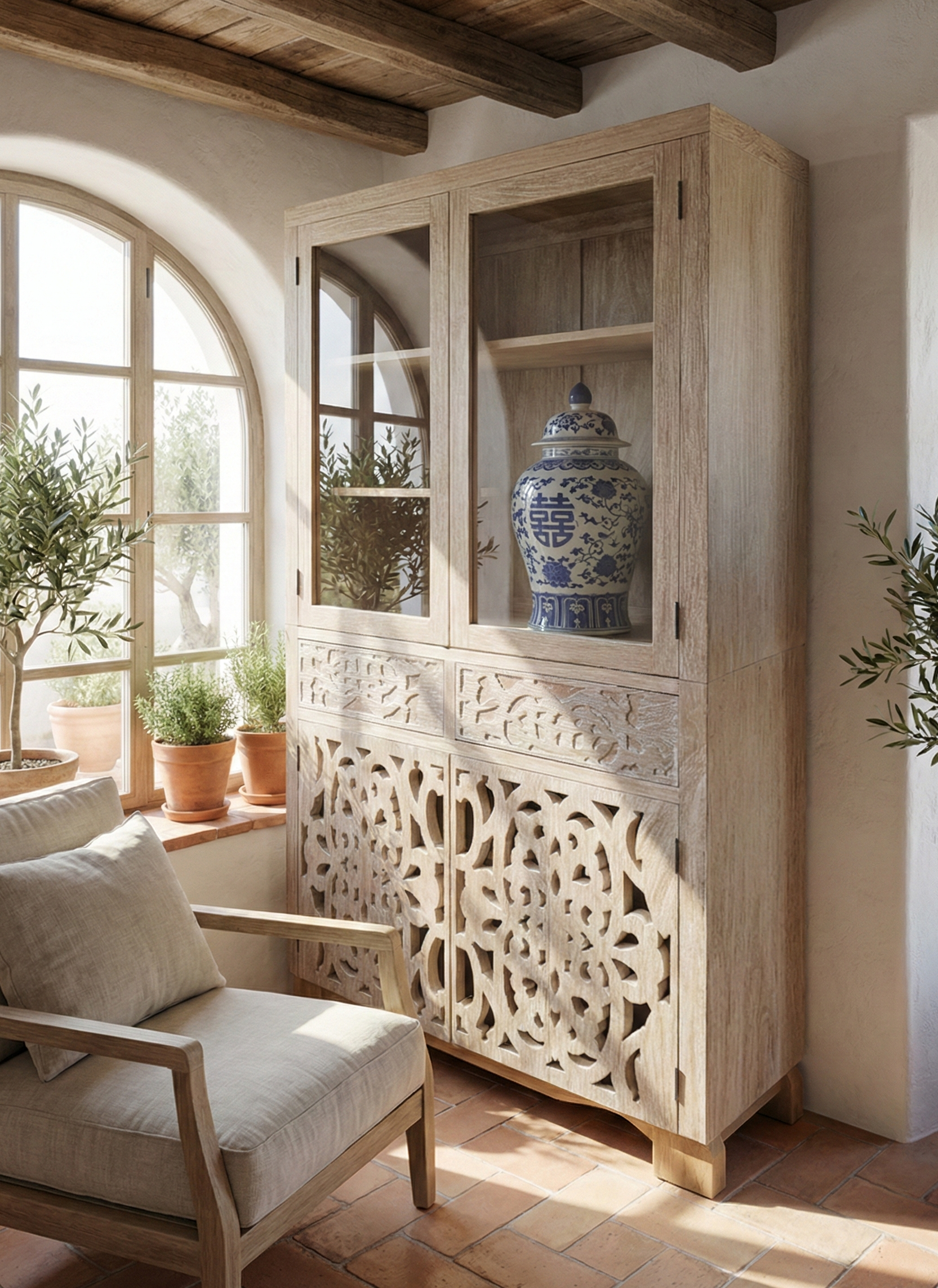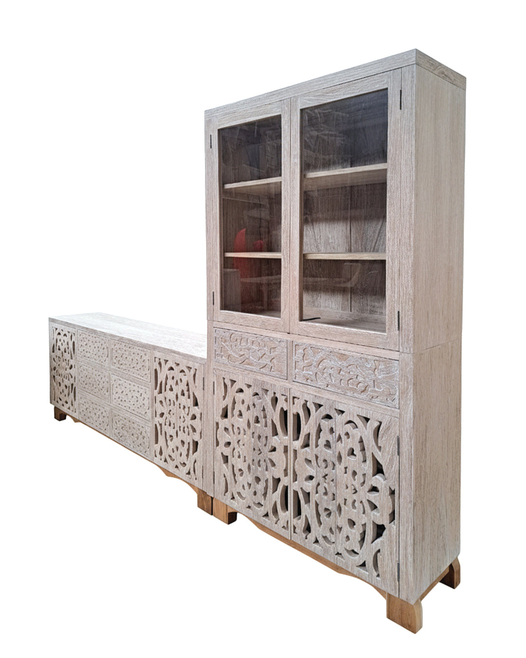 Vitrina colonial de teca , completamente personalizable según tus preferencias. Configura libremente la disposición de puertas talladas y cajones para crear una pieza única adaptada a tu hogar. El acabado decapado realza la veta natural de la madera, aportando carácter y elegancia atemporal. Construcción robusta en teca maciza que garantiza durabilidad excepcional. Puertas con tallados artesanales que reflejan el estilo colonial auténtico. Una solución de almacenamiento original que combina funcionalidad con distinción estética.