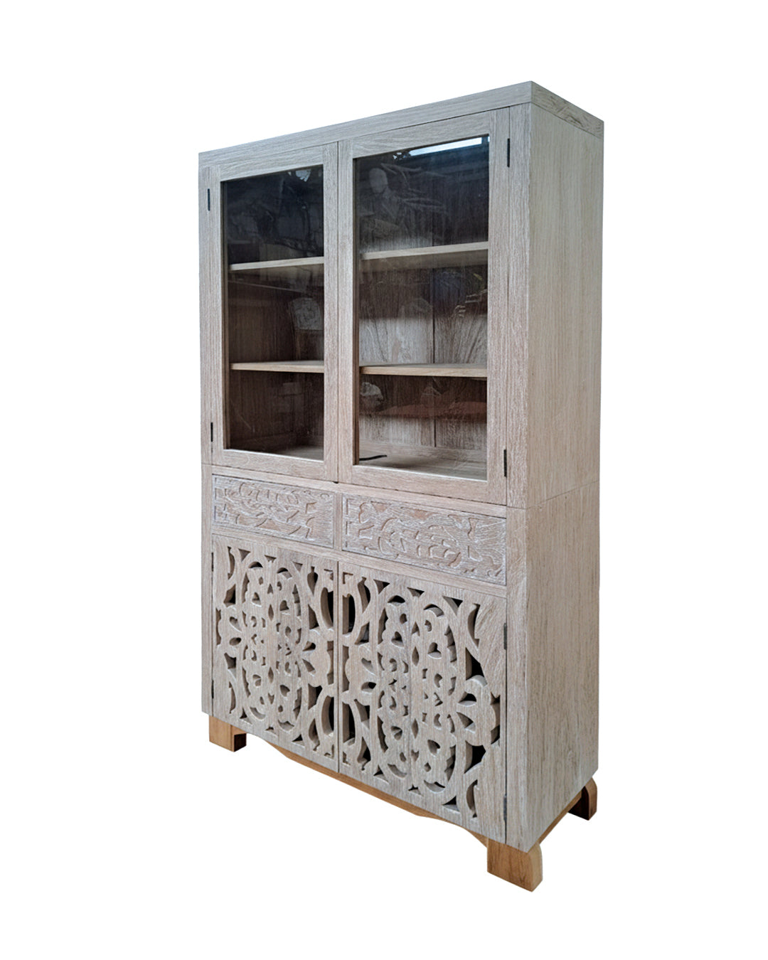Vitrina a medida en teca blanco decapado con puertas talladas - AM-14387