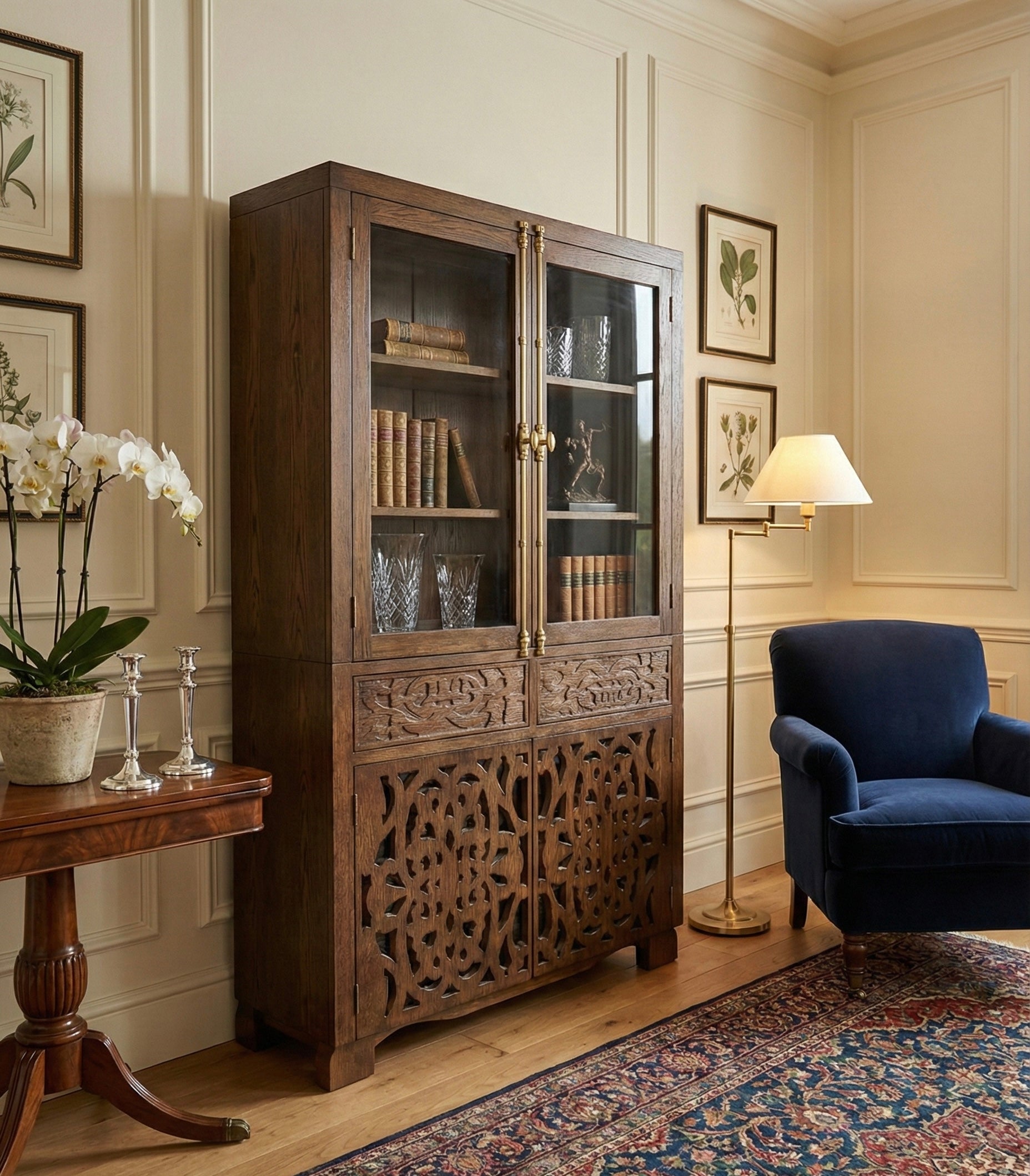 Vitrina colonial a medida en teca puertas talladas - AM-14387