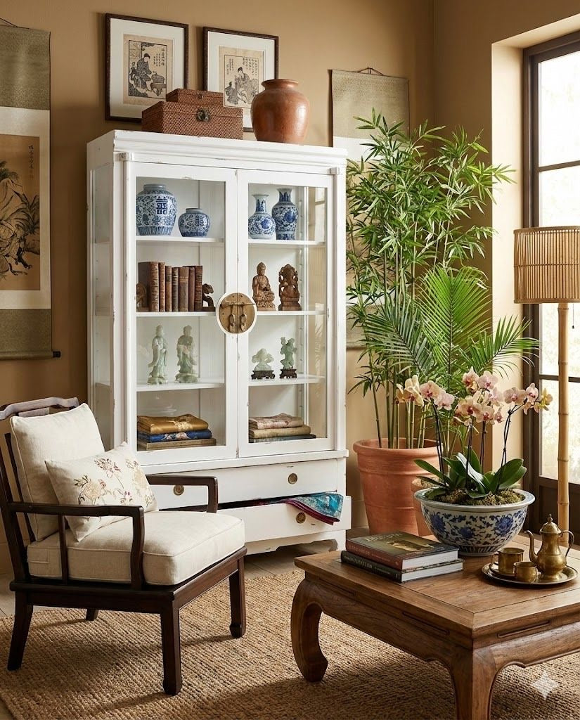 Vitrina Opium a medida colonial asiática. Esta vitrina a medida combina la elegancia del estilo colonial asiático con funcionalidad contemporánea. Cada pieza se personaliza según tus necesidades específicas, permitiéndote adaptar dimensiones, compartimentos y acabados a tu espacio. Fabricada con materiales de calidad superior, destaca por su estructura robusta y detalles ornamentales que evocan la tradición oriental. Perfecta para exhibir colecciones valiosas, objetos decorativos o como elemento diferenciador en cualquier ambiente. Una solución de almacenamiento que trasciende lo convencional, transformando tu hogar en un espacio con carácter y distinción.